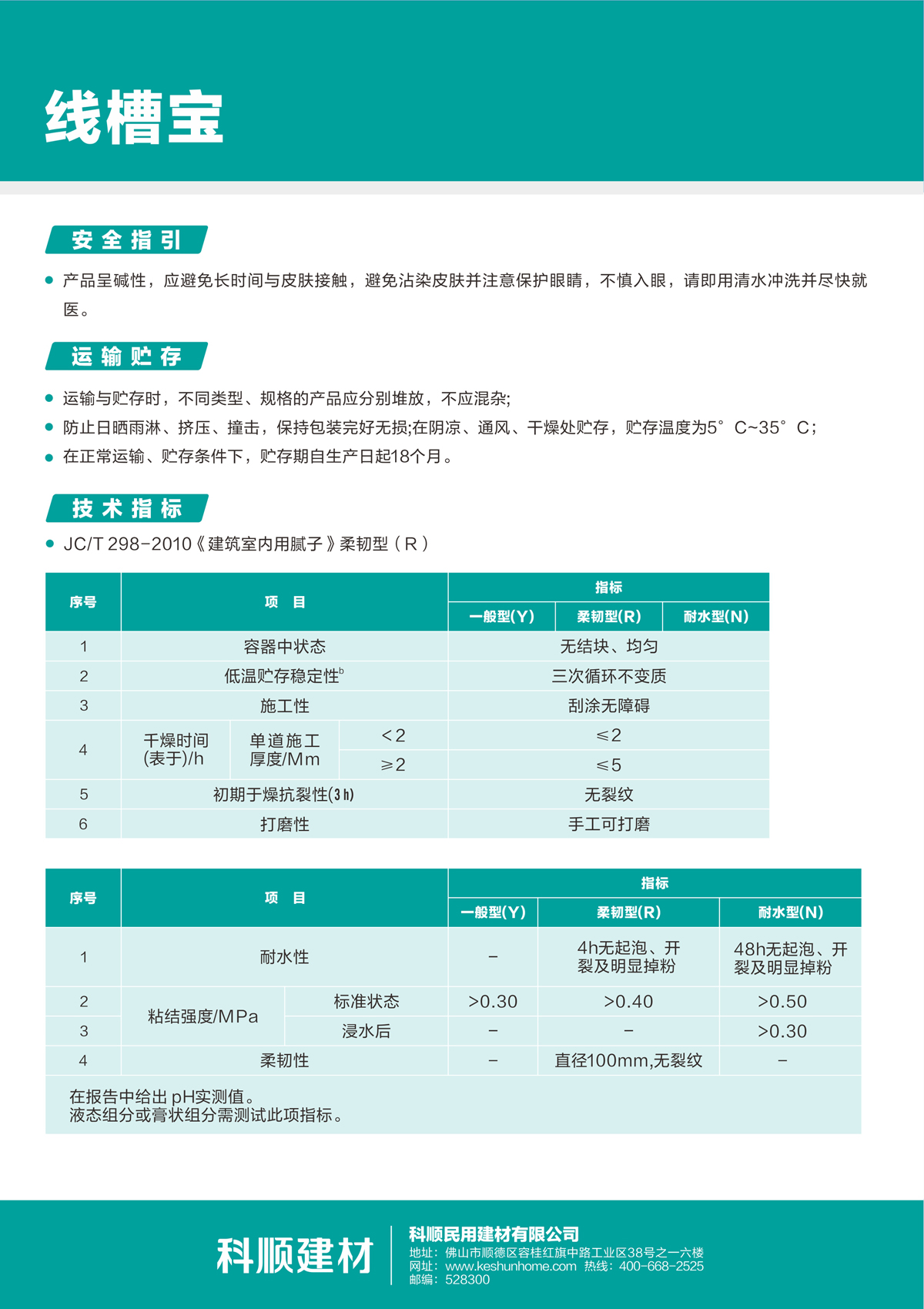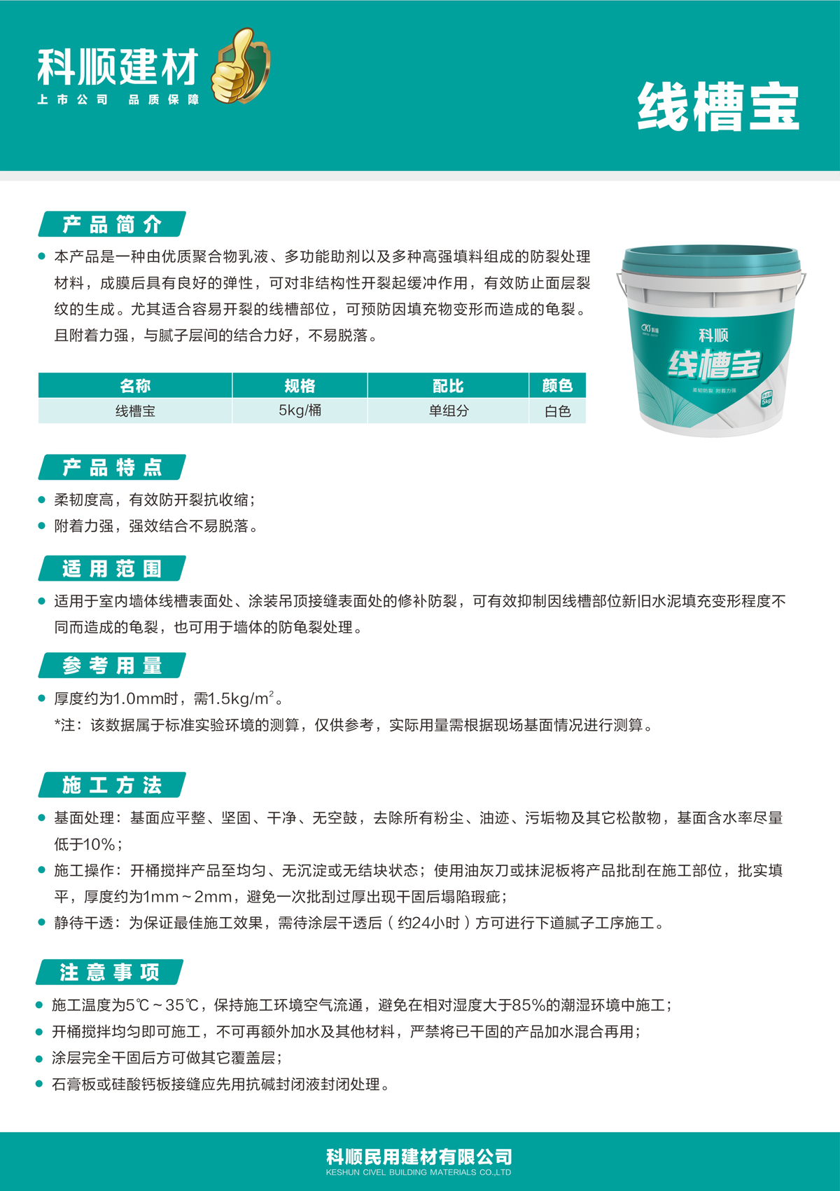 本产品是一种由优质聚合物乳液、多功能助剂以及多种高强填料组成的防裂处理材料,成膜后具有良好的弹性,可对非结构性开裂起缓冲作用,有效防止面层裂纹的生成。尤其适合容易开裂的线槽部位,可预防因填充物变形而造成的龟裂。且附着力强,与腻子层间的结合力好,不易脱落。