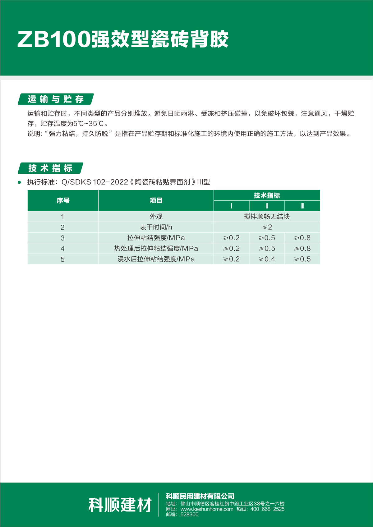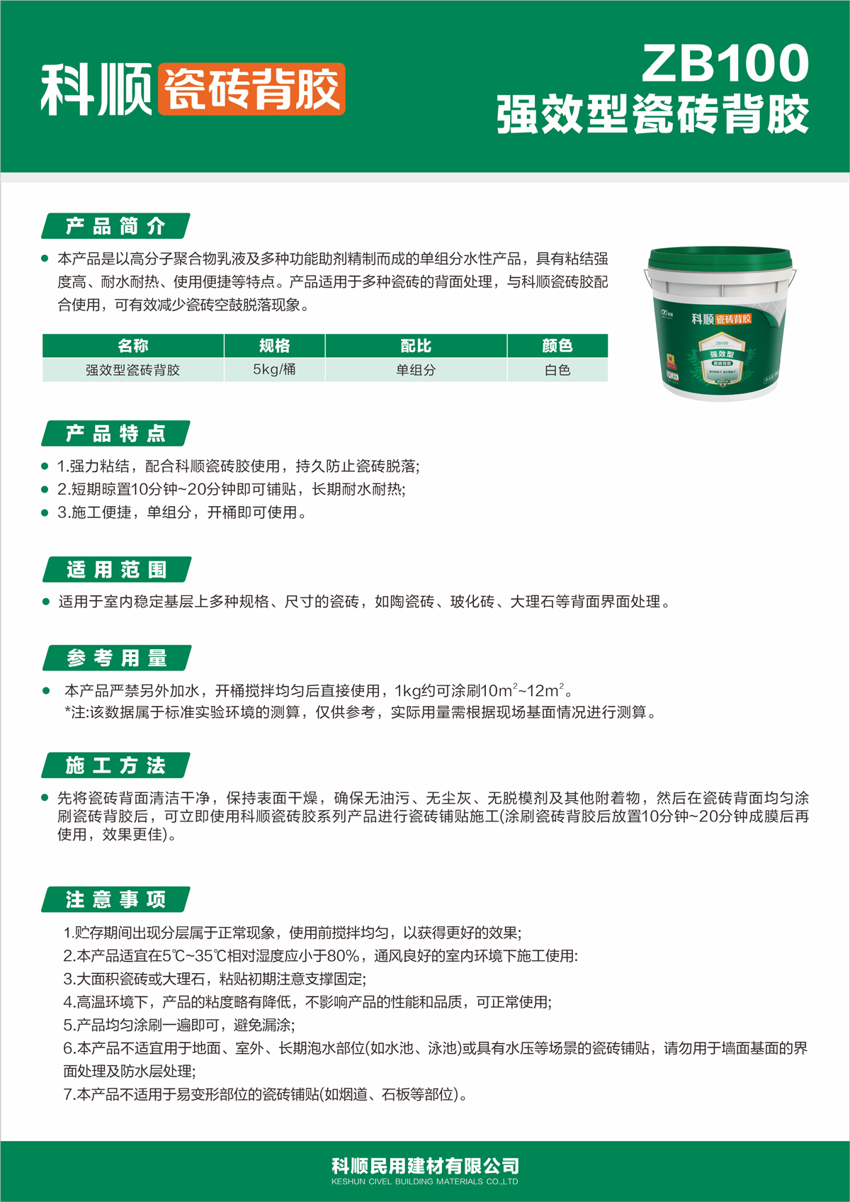 本产品是以高分子聚合物乳液及多种功能助剂精制而成的单组分水性产品,具有粘结强度高、耐水耐热、使用便捷等特点。产品适用于多种瓷砖的背面处理,与科顺瓷砖胶配合使用,可有效减少瓷砖空鼓脱落现象。