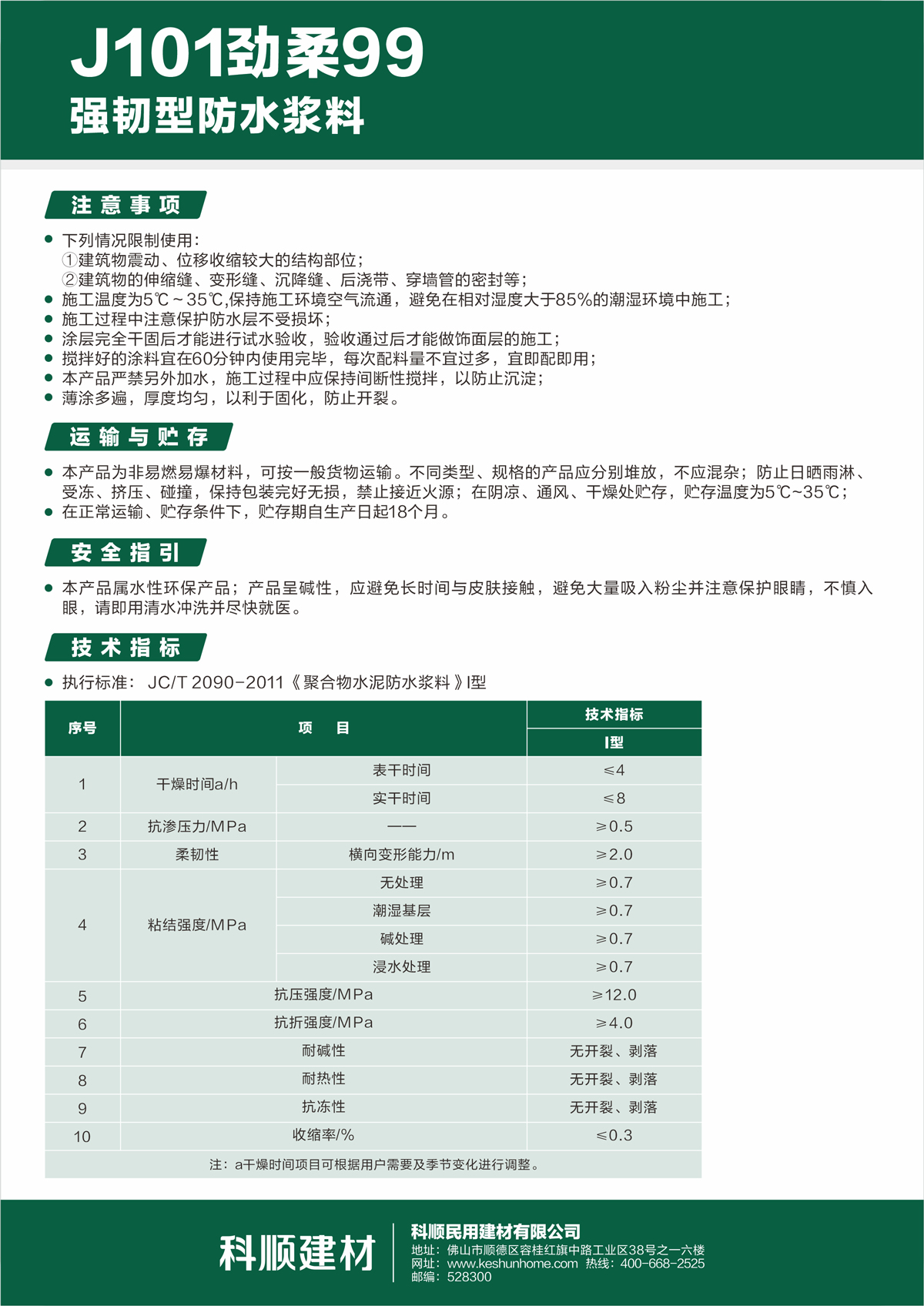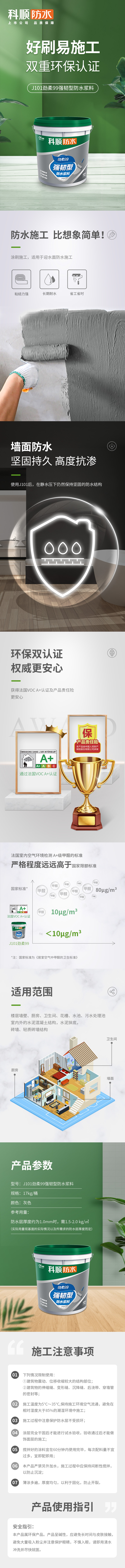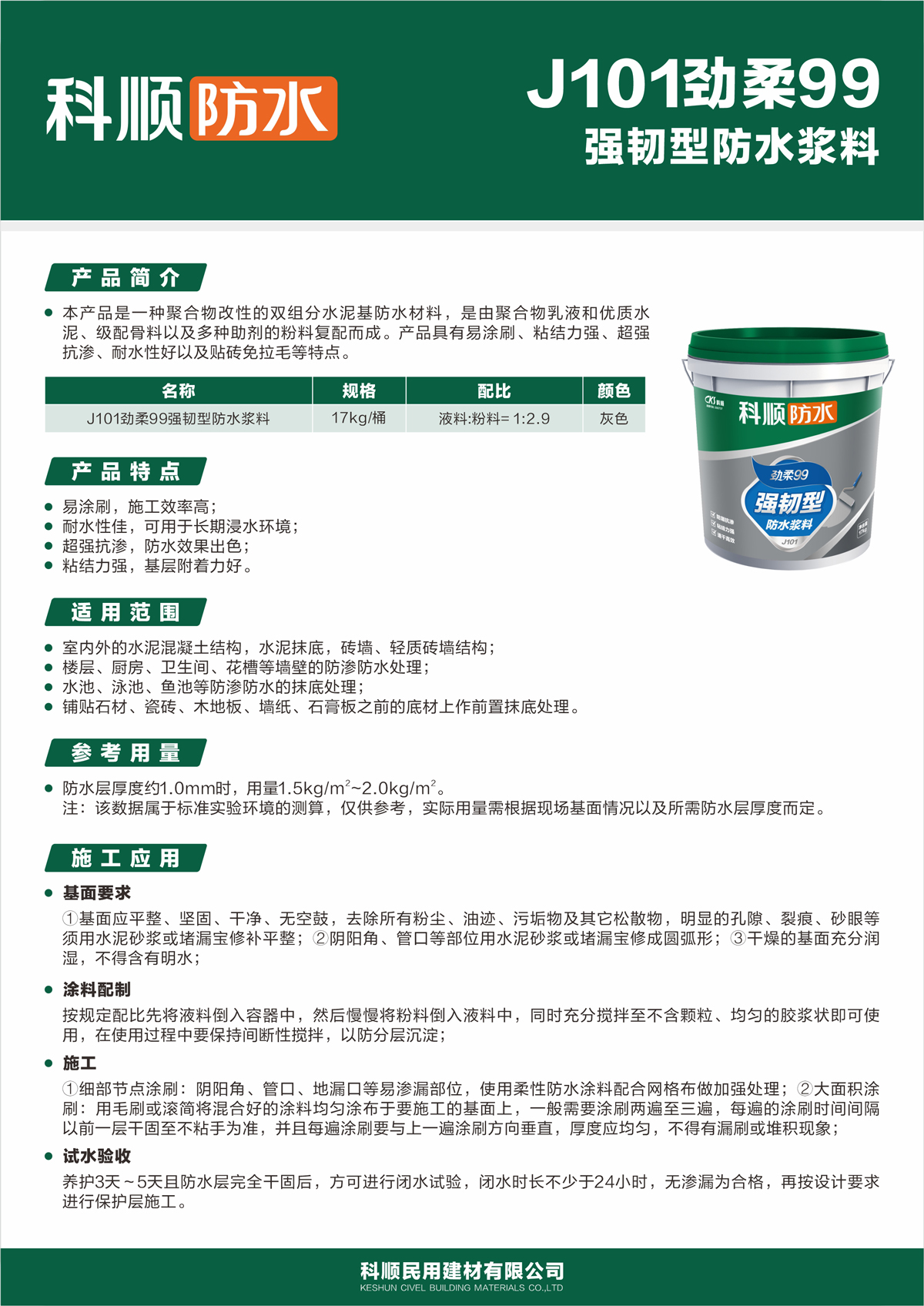 本产品是一种聚合物改性的双组分水泥基防水材料,是由聚合物乳液和优质水泥、级配骨料以及多种助剂的粉料复配而成。产品具有易涂刷、粘结力强、超强抗渗、耐水性好以及贴砖免拉毛等特点。