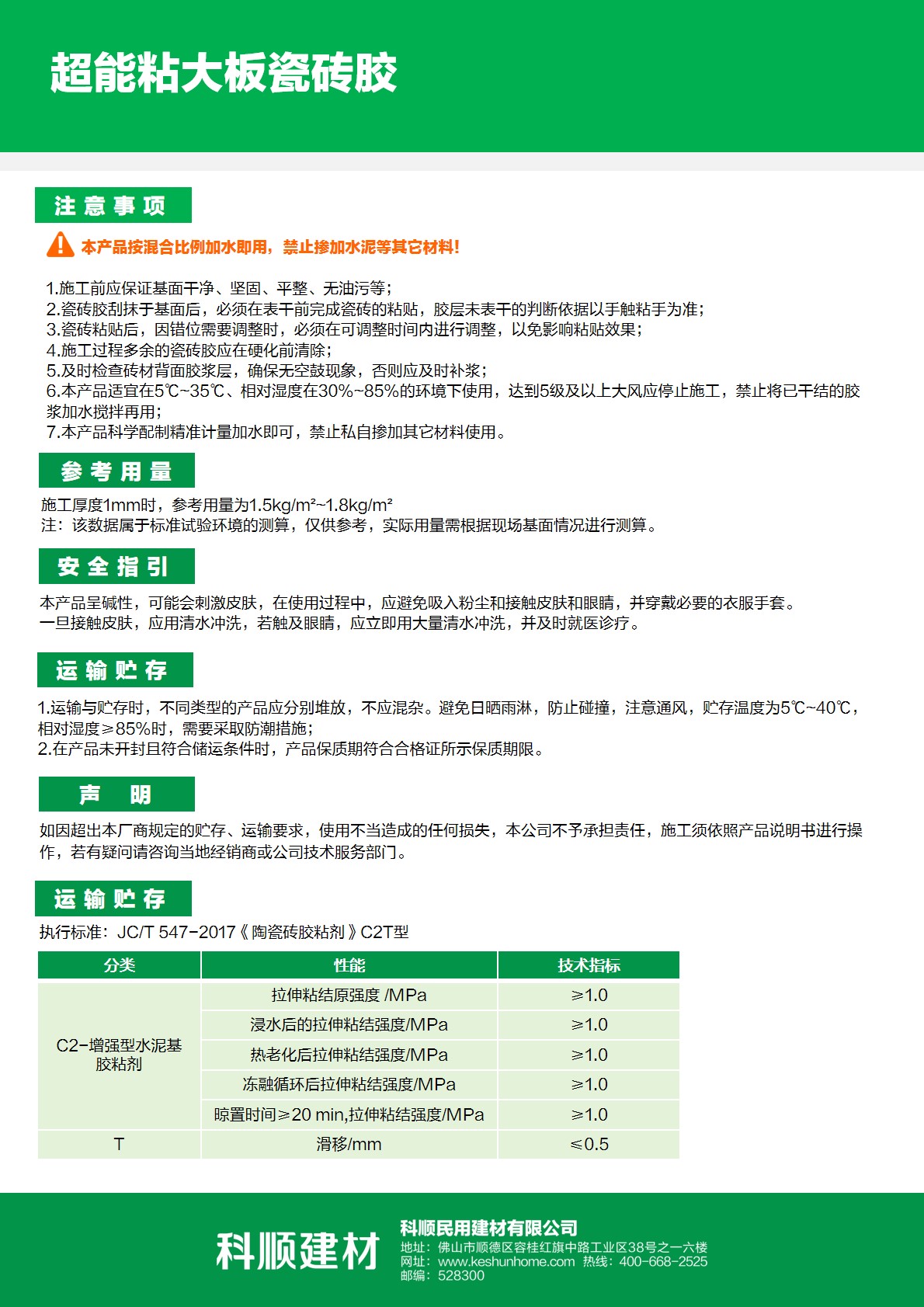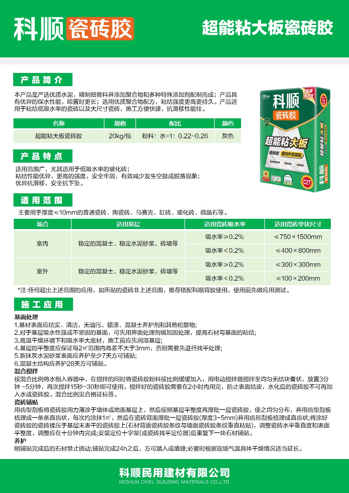 本产品是严选优质水泥,精制细骨料并添加聚合物和多种特殊添加剂配制而成;产品具有优异的保水性能,晾置时更长;选用优质聚合物配方,粘结强度更高更持久。产品适用于粘结低吸水率的瓷砖以及大尺寸瓷砖,施工方便快捷,抗移性能佳。