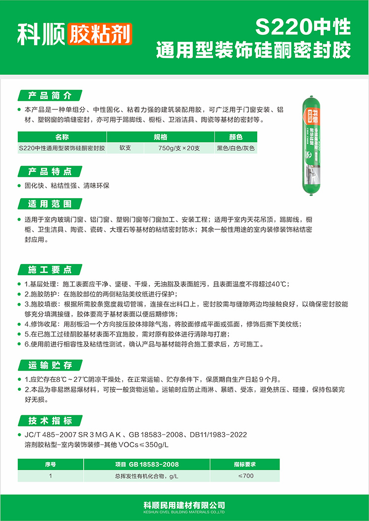 本产品是一种单组分、中性固化、粘着力强的建筑装配用胶,可广泛用于门窗安装、铝材、塑钢窗的填缝密封,亦可用于踢脚线、橱柜、卫浴洁具、陶瓷等基材的密封等。