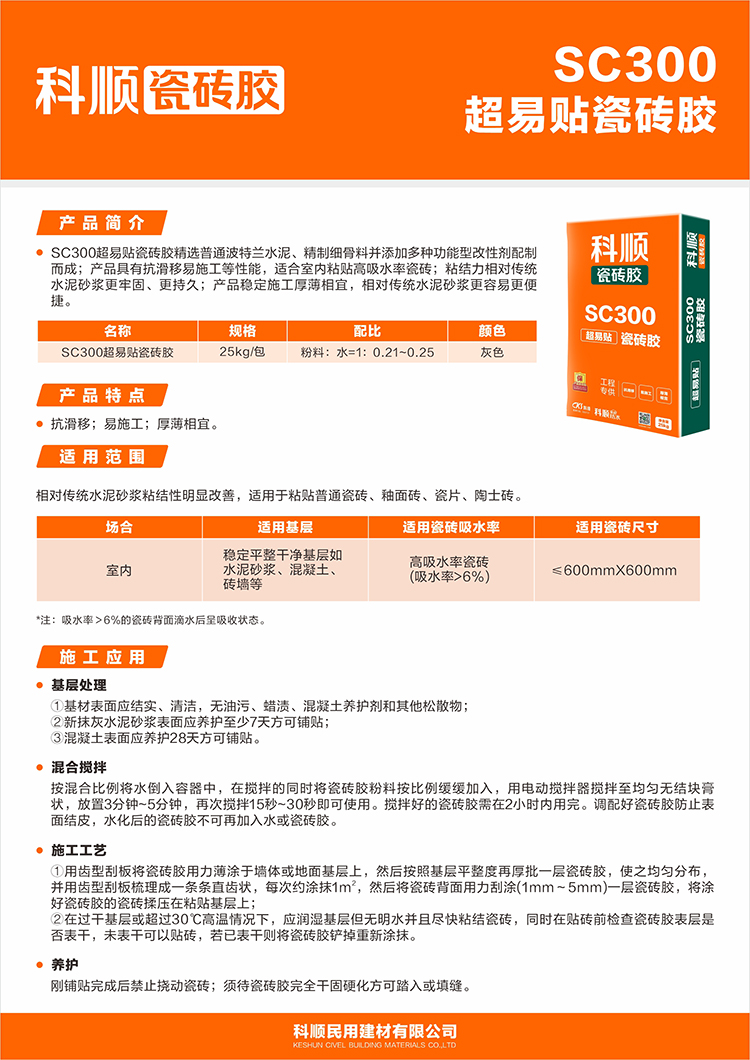 SC300超易贴瓷砖胶精选普通波特兰水泥、精制细骨料并添加多种功能型改性剂配制而成;产品具有抗滑移易施工等性能,适合室内粘贴高吸水率瓷砖;粘结力相对传统瓷砖胶水泥砂浆更牢固、更持久;产品稳定施工厚薄相宜,相对传统水泥砂浆更容易更便捷。
