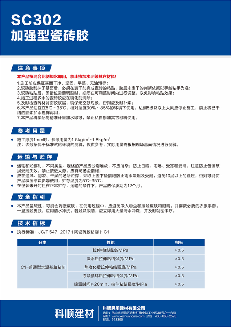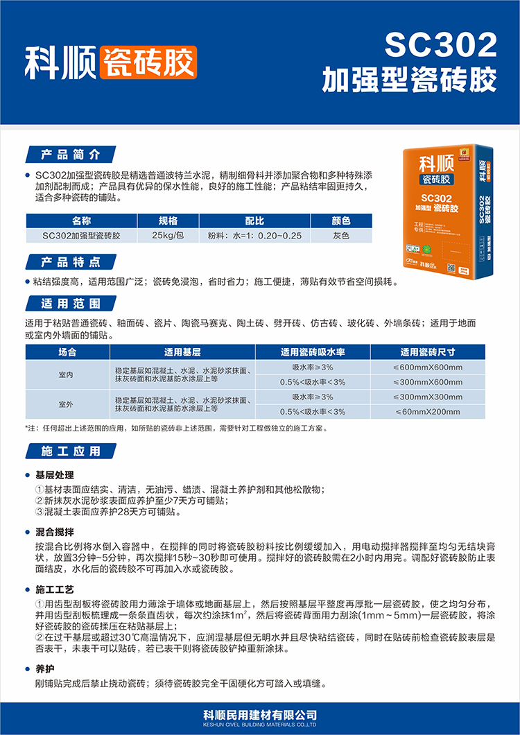 SC302加强型瓷砖胶是精选普通波特兰水泥,精制细骨料并添加聚合物和多种特殊添瓷砖胶加剂配制而成;产品具有优异的保水性能,良好的施工性能;产品粘结牢固更持久,适合多种瓷砖的铺贴。