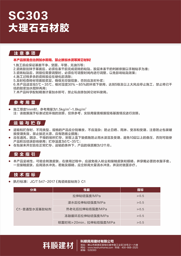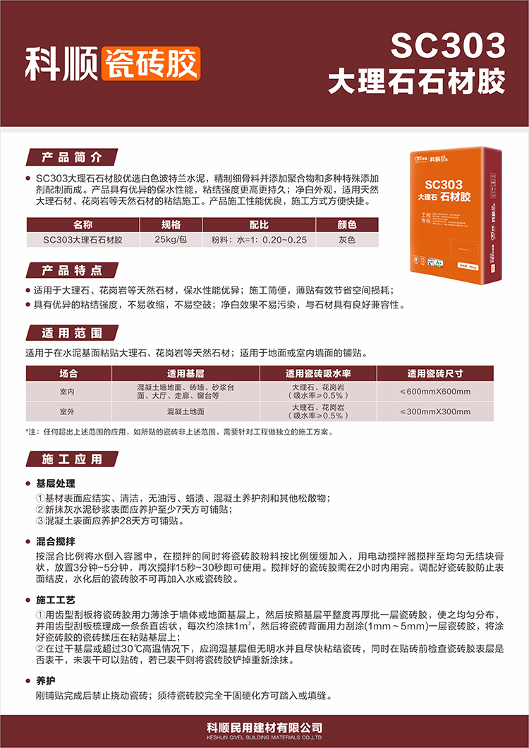 SC303大理石石材胶优选白色波特兰水泥,精制细骨料并添加聚合物和多种特殊添加剂配制而成。产品具有优异的保水性能,粘结强度更高更持久;净白外观,适用天然大理石材、花岗岩等天然石材的粘结施工。产品施工性能优良,施工方式方便快捷。