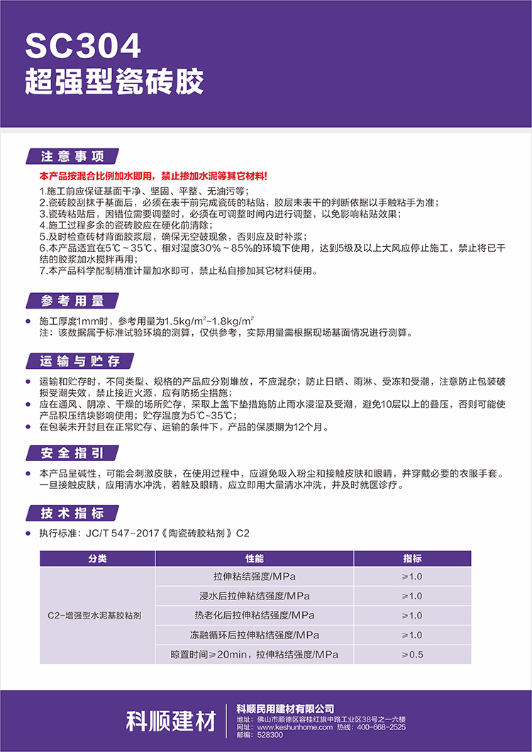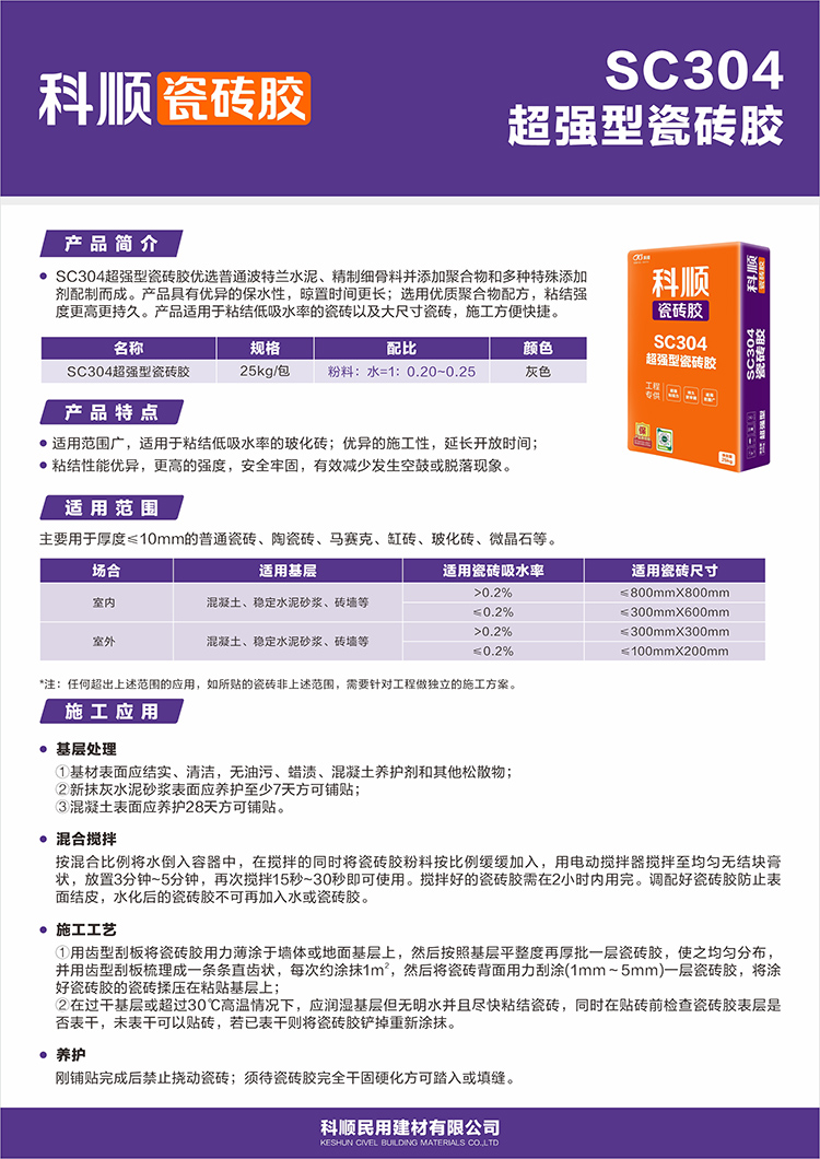SC304超强型瓷砖胶优选普通波特兰水泥、精制细骨料并添加聚合物和多种特殊添加剂配制而成。产品具有优异的保水性,晾置时间更长;选用优质聚合物配方,粘结强度更高更持久。产品适用于粘结低吸水率的瓷砖以及大尺寸瓷砖,施工方便快捷。