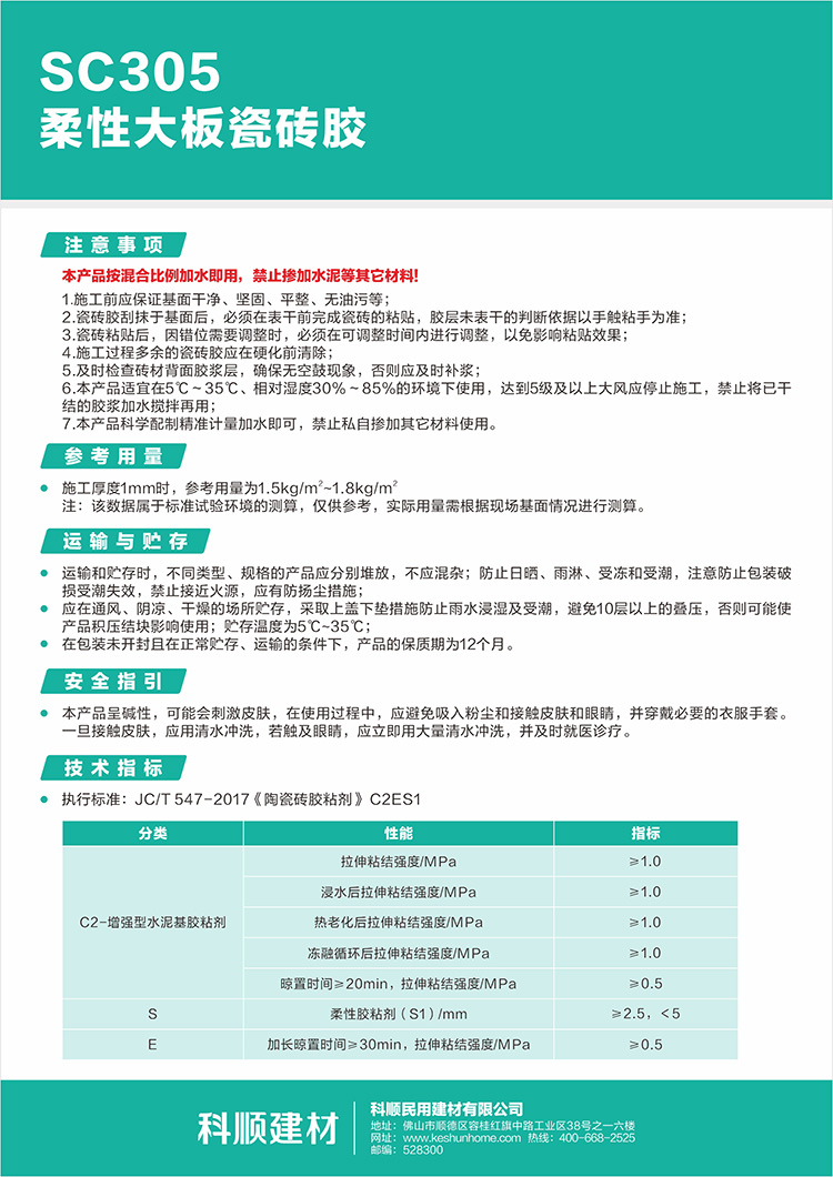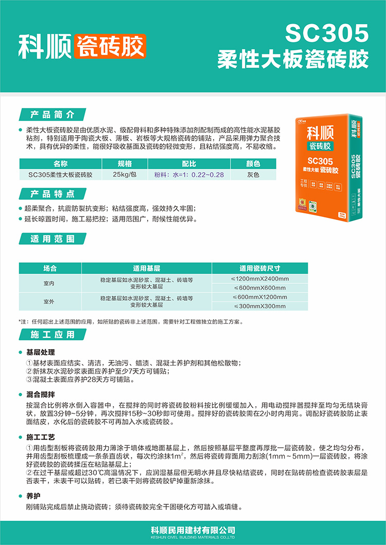 柔性大板瓷砖胶是由优质水泥、级配骨料和多种特殊添加剂配制而成的高性能水泥基胶粘剂,特别适用于陶瓷大板、薄板、岩板等大规格瓷砖的铺贴,产品采用弹力聚合技术,具有优异的柔性,能很好吸收基面及瓷砖的轻微变形,且粘结强度高,不易收缩。
