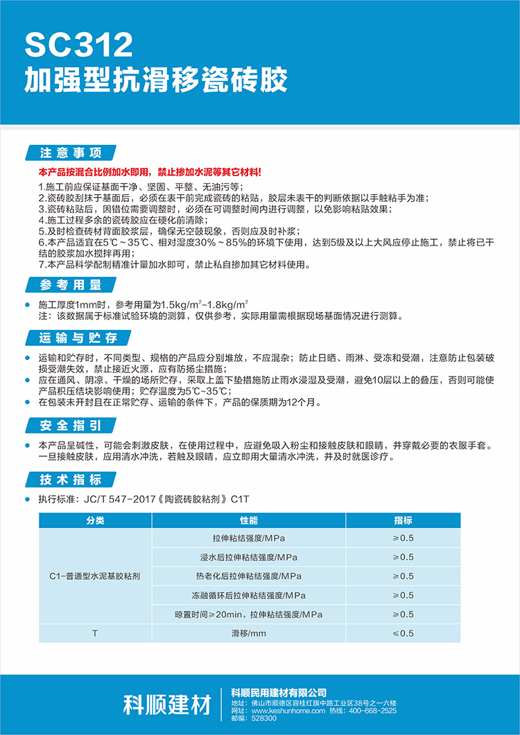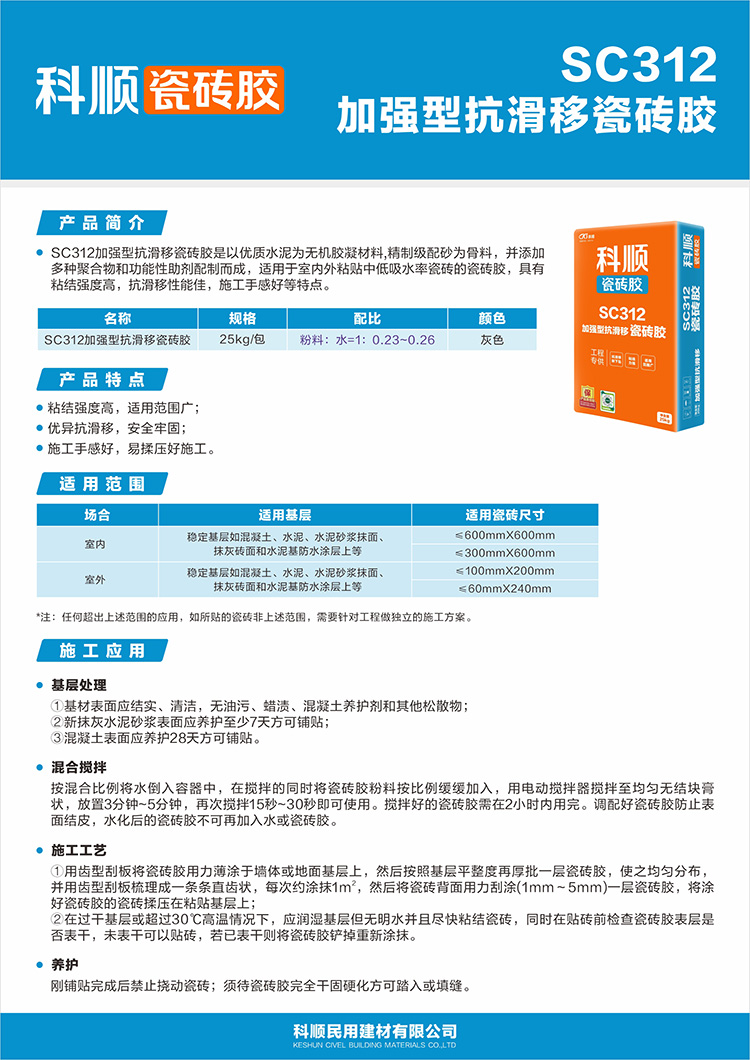 SC312加强型抗滑移瓷砖胶是以优质水泥为无机胶凝材料,精制级配砂为骨料,并添加多种聚合物和功能性助剂配制而成,适用于室内外粘贴中低吸水率瓷砖的瓷砖胶,具有粘结强度高,抗滑移性能佳,施工手感好等特点。