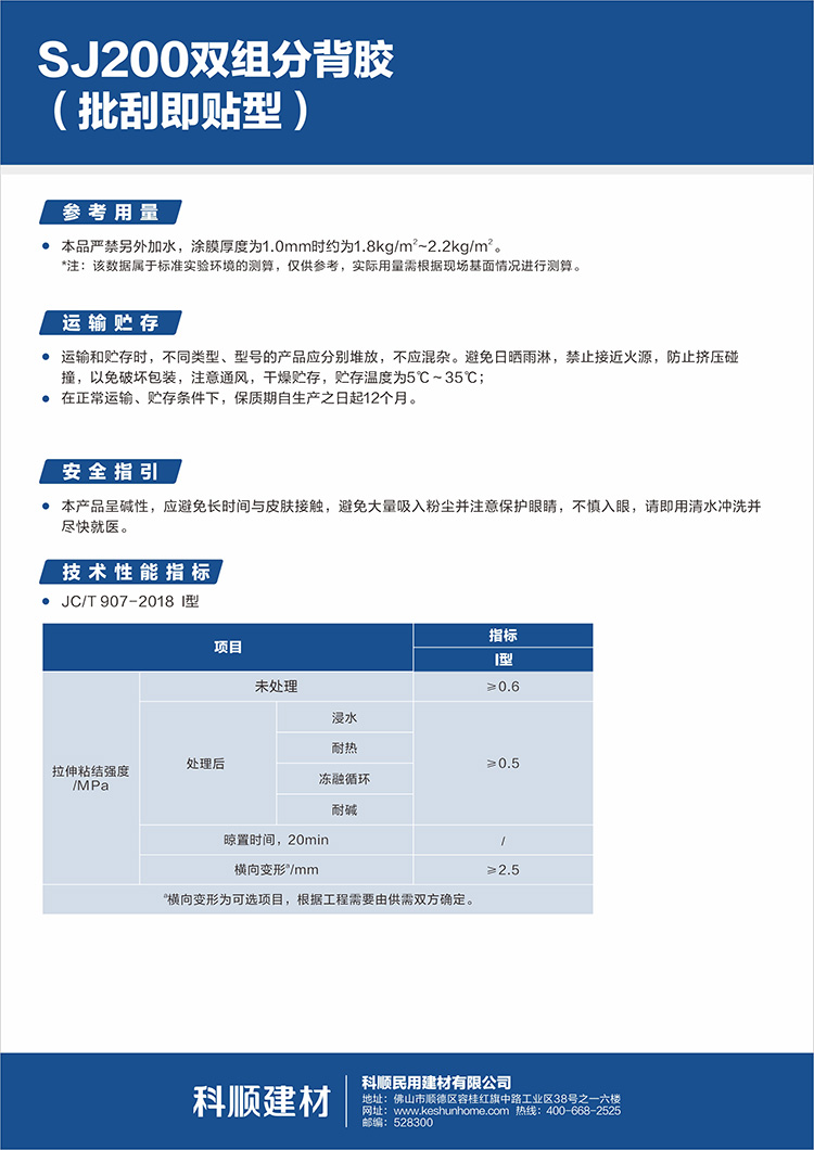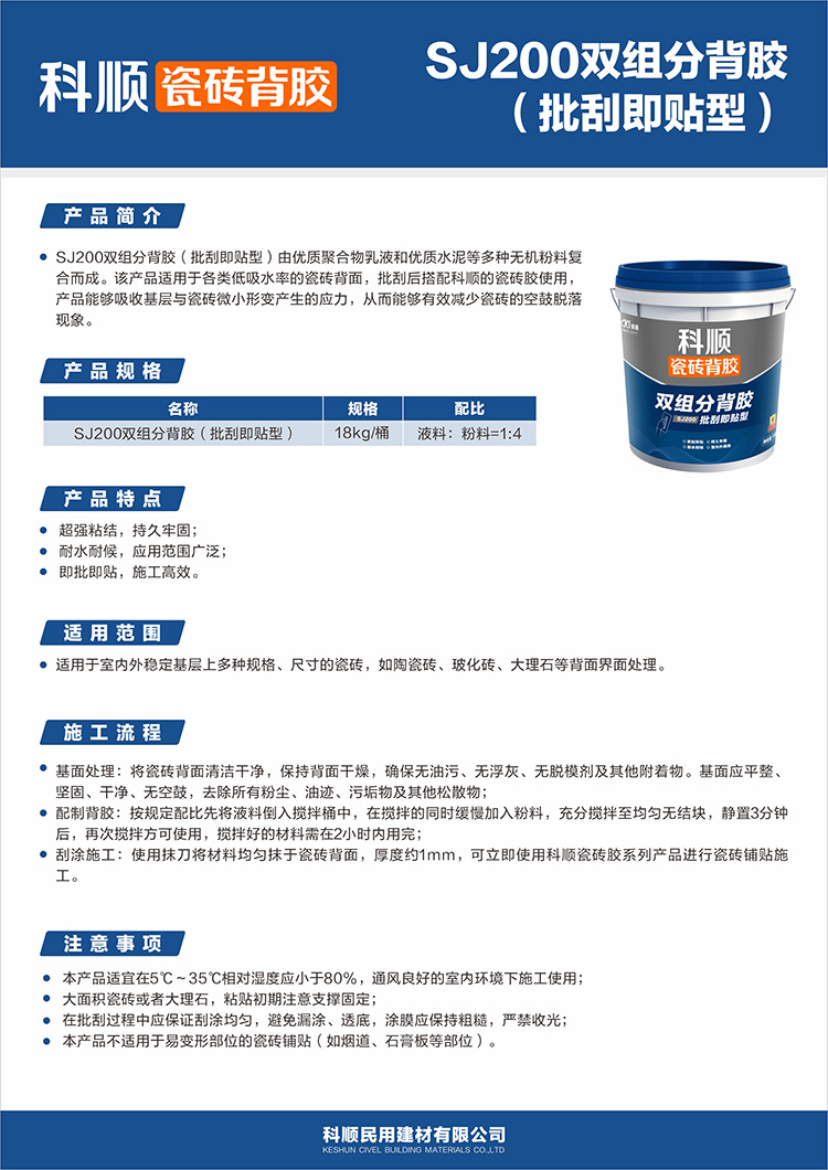 SJ200双组分背胶(批刮即贴型)由优质聚合物乳液和优质水泥等多种无机粉料复合而成。该产品适用于各类低吸水率的瓷砖背面,批刮后搭配科顺的瓷砖胶使用,产品能够吸收基层与瓷砖微小形变产生的应力,从而能够有效减少瓷砖的空鼓脱落现象。