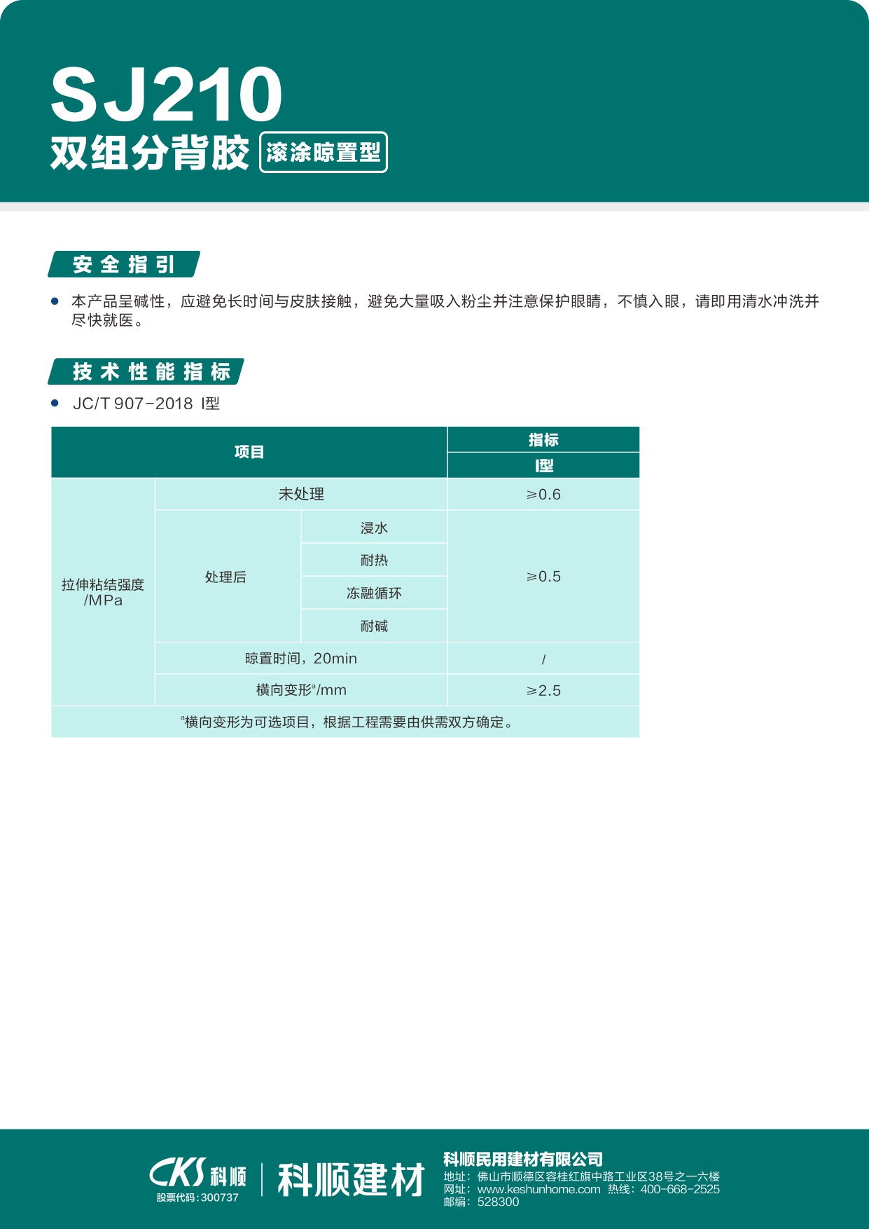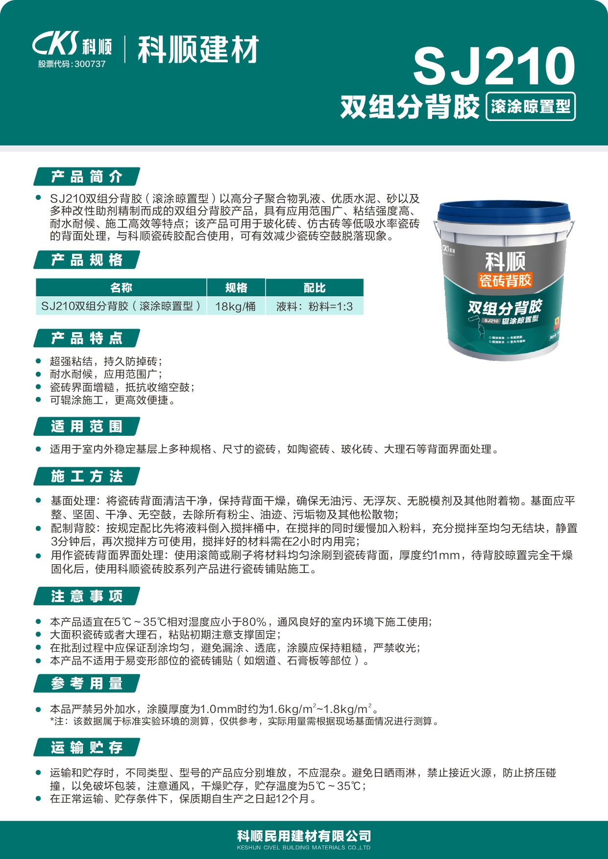 SJ210双组分背胶(滚涂晾置型)以高分子聚合物乳液、优质水泥、砂以及多种改性助剂精制而成的双组分背胶产品,具有应用范围广、粘结强度高、耐水耐候、施工高效等特点;该产品可用于玻化砖、仿古砖等低吸水率瓷砖的背面处理,与科顺瓷砖胶配合使用,可有效减少瓷砖空鼓脱落现象。