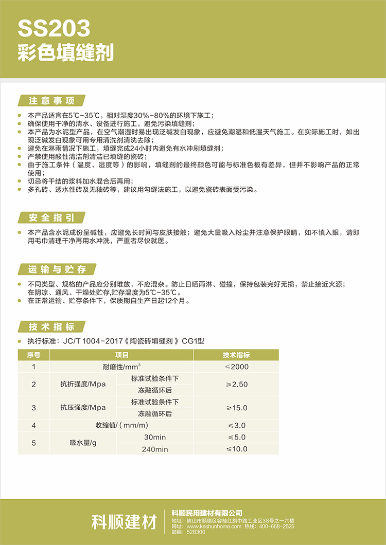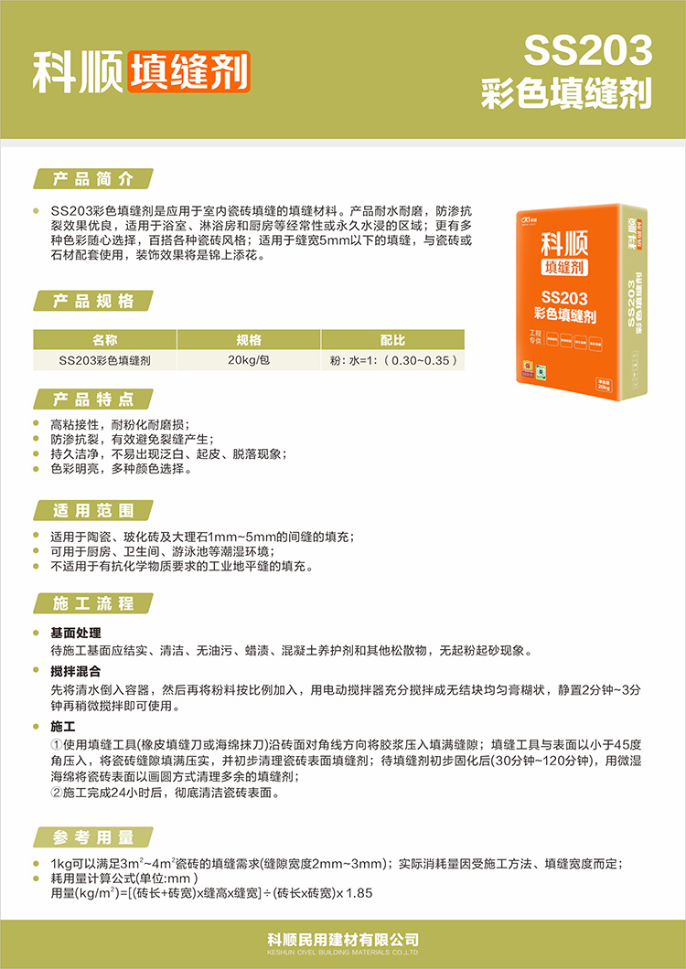 SS203彩色填缝剂是应用于室内瓷砖填缝的填缝材料。产品耐水耐,防渗抗裂效果优良,适用于浴室、淋浴房和厨房等经常性或永久水浸的区域;更有多种色彩随心选择,百搭各种瓷砖风格;适用于缝宽5mm以下的填缝,与瓷砖或石材配套使用,装饰效果将是锦上添花。