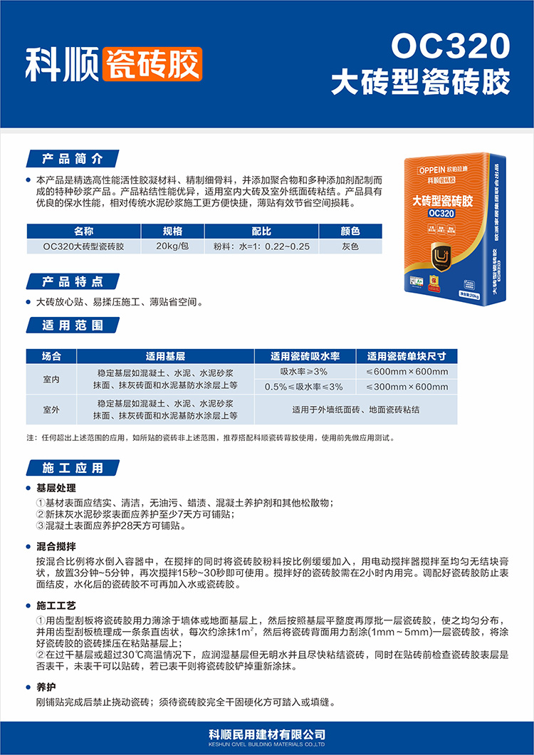 本产品是精选高性能活性胶凝材料、精制细骨料,并添加聚合物和多种添加剂配制而成的特种砂浆产品。产品粘结性能优异,适用室内大砖及室外纸面砖粘结。产品具有优良的保水性能,相对传统水泥砂浆施工更方便快捷,薄贴有效节省空间损耗。