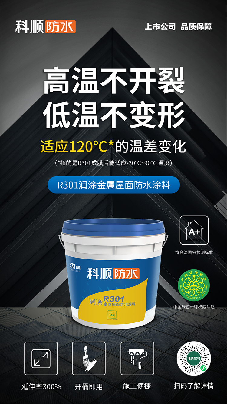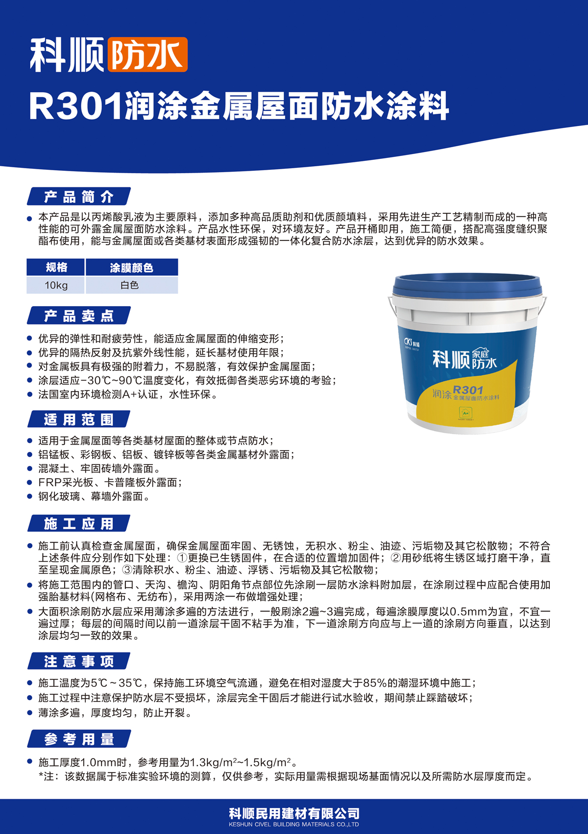 本产品是以丙烯酸乳液为主要原料,添加多种高品质助剂和优质颜填料,采用先进生产工艺精制而成的一种高性能的金属屋面防水涂料。产品水性环保,对环境友好。产品开桶即用,施工简便,搭配高强度缝织聚酯布使用,能与金属屋面或各类基材表面无缝结合,形成强韧的一体化复合防水涂层,达到优异的防水效果。