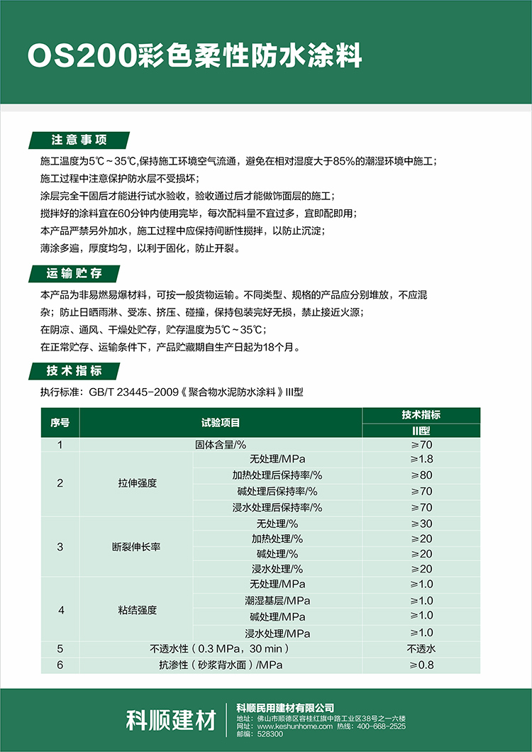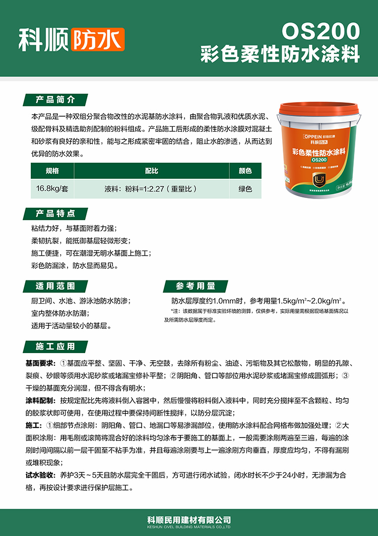 本产品是一种双组分聚合物改性的水泥基防水涂料,由聚合物乳液和优质水泥、级配骨料及精选助剂配制的粉料组成。产品施工后形成的柔性防水涂膜对混凝士和砂浆有良好的亲和性,能与之形成紧密牢固的结合,阻止水的渗透,从而达到优异的防水效果。