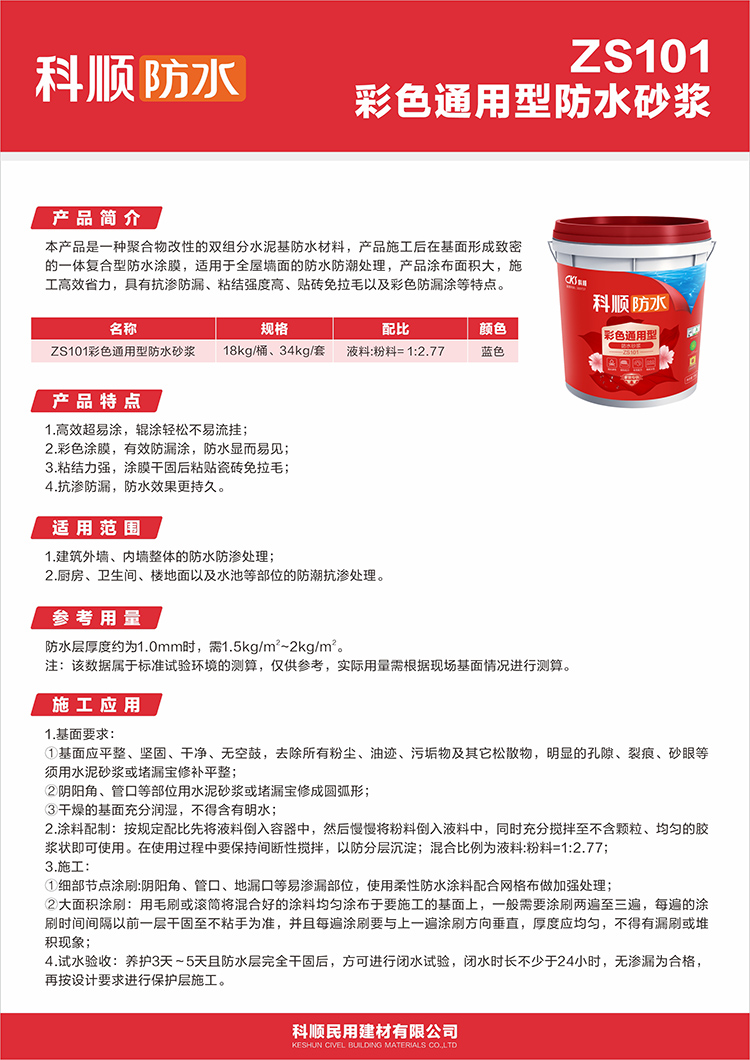 本产品是一种聚合物改性的双组分水泥基防水材料,产品施工后在基面形成致密的一体复合型防水涂膜,适用于全屋墙面的防水防潮处理,产品涂布面积大,施工高效省力,具有抗渗防漏、粘结强度高、贴砖免拉毛以及彩色防漏涂等特点。