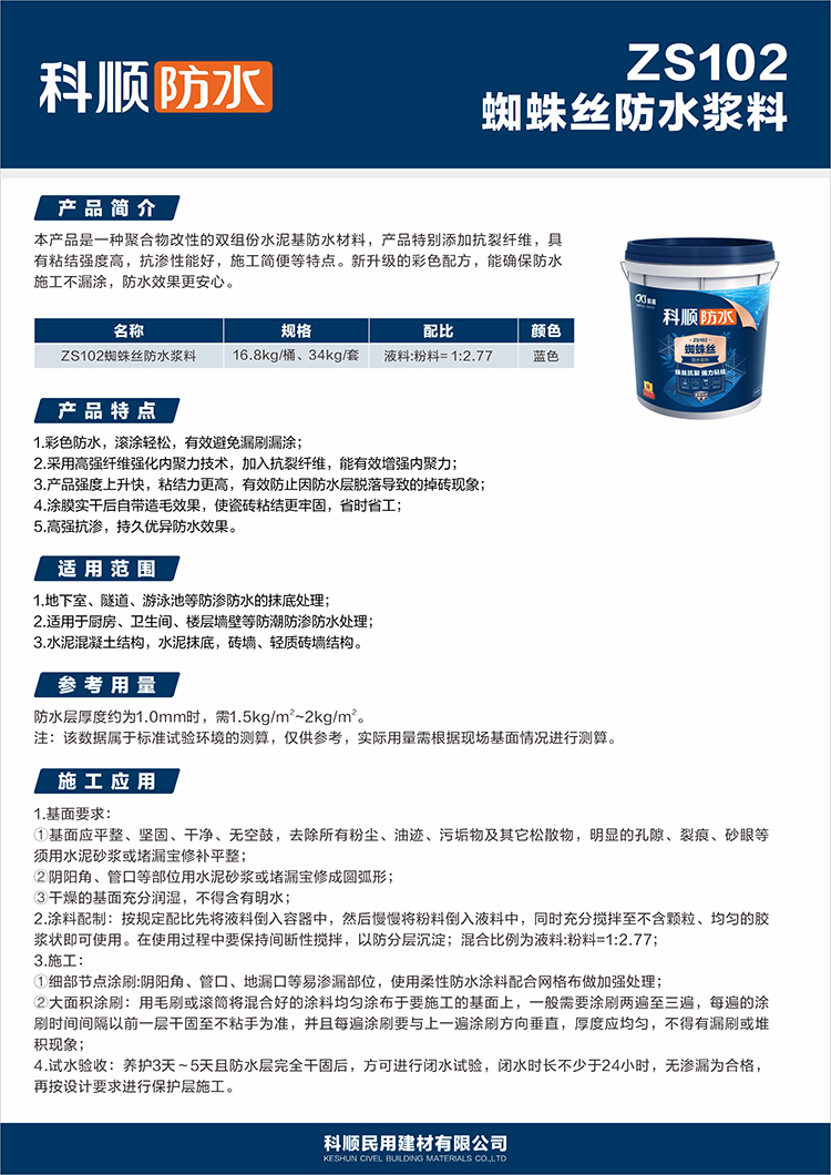 本产品是一种聚合物改性的双组份水泥基防水材料,产品特别添加抗裂纤维,具有粘结强度高,抗渗性能好,施工简便等特点。新升级的彩色配方,能确保防水施工不漏涂,防水效果更安心。