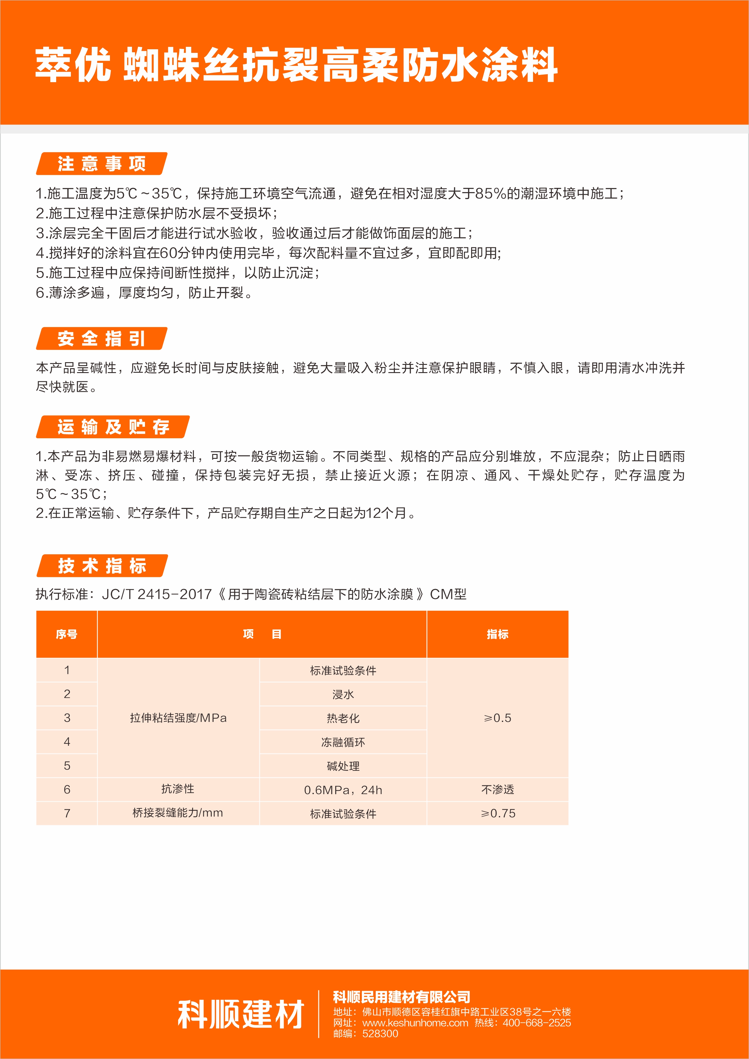 本产品是由净味环保的高分子聚合物乳液和特种水泥,辅以特殊功能性助剂制备而成的,产品特别添加抗裂纤维,涂层固化后形成柔韧、致密、抗裂的防水涂膜,能有效提高粘结强度及拉伸性能等,采用的净味技术,家人和施工者能够安心呼吸。