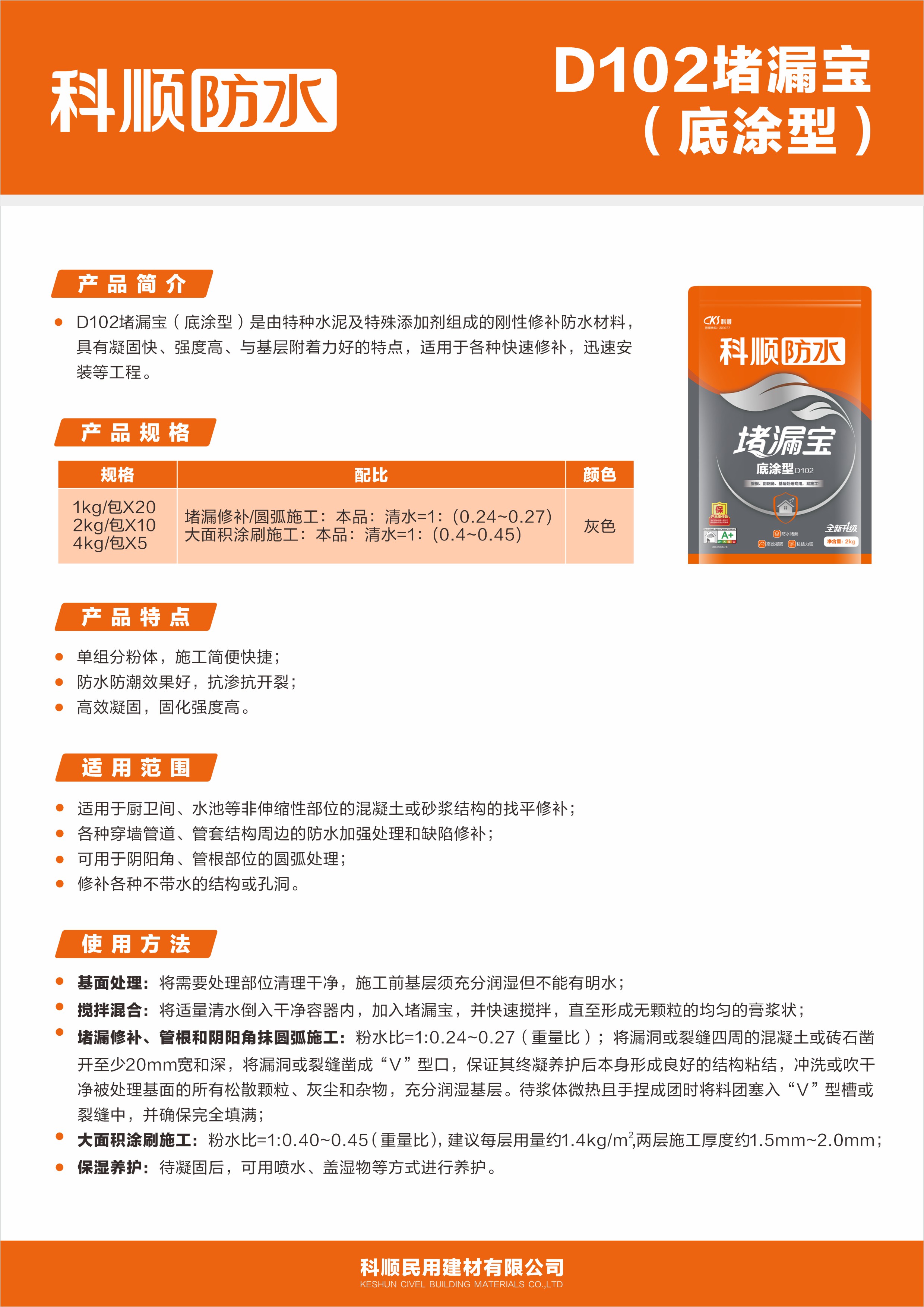 D102堵漏宝(底涂型)是由特种水泥及特殊添加剂组成的刚性修补防水材料,具有凝固快、强度高、与基层附着力好的特点,适用于各种快速修补,迅速安装等工程。