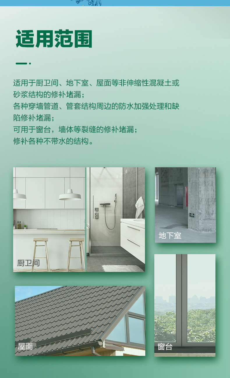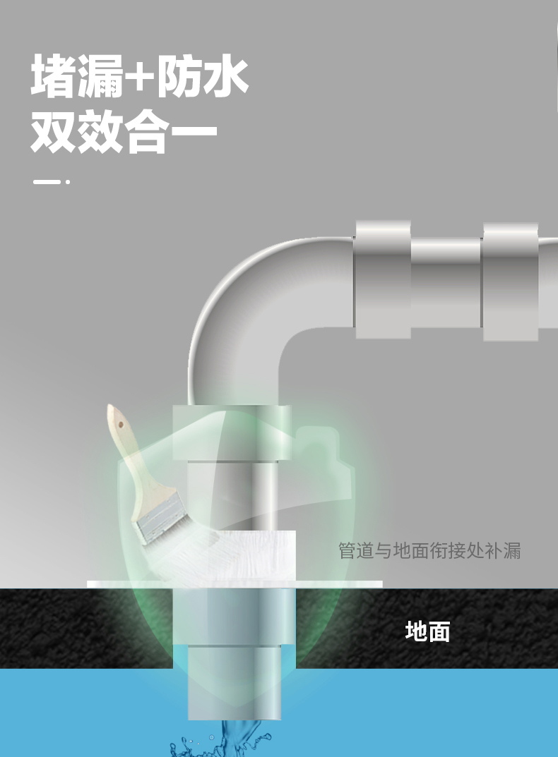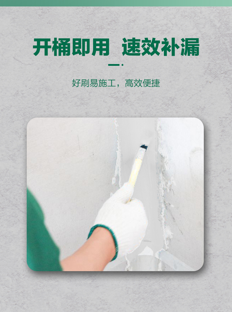 本产品是集堵漏和防水于一体的水性丙烯酸类产品。产品具有粘结力强、拉伸强度高、延伸性能好、适应基层开裂变形能力强等特点。产品适用于混凝土等基材表面的快速修补堵漏。产品以水作为分散介质,是一款水性环保的修补专用防水涂料产品。