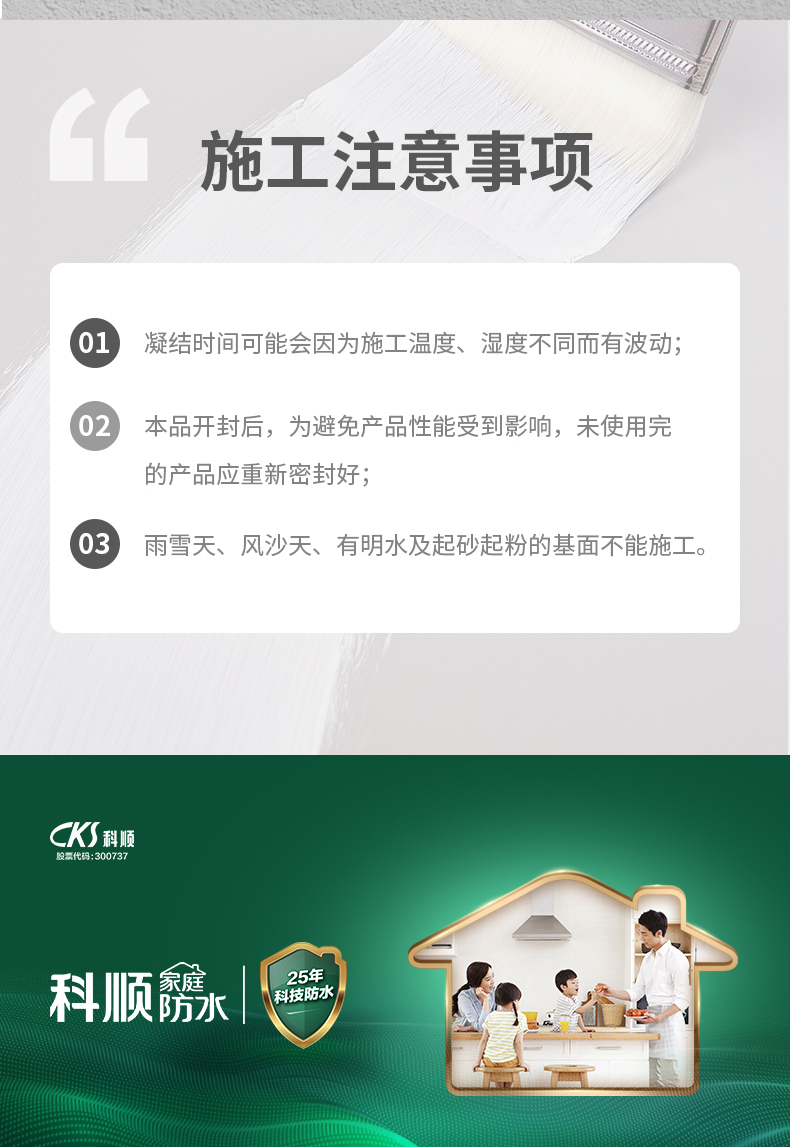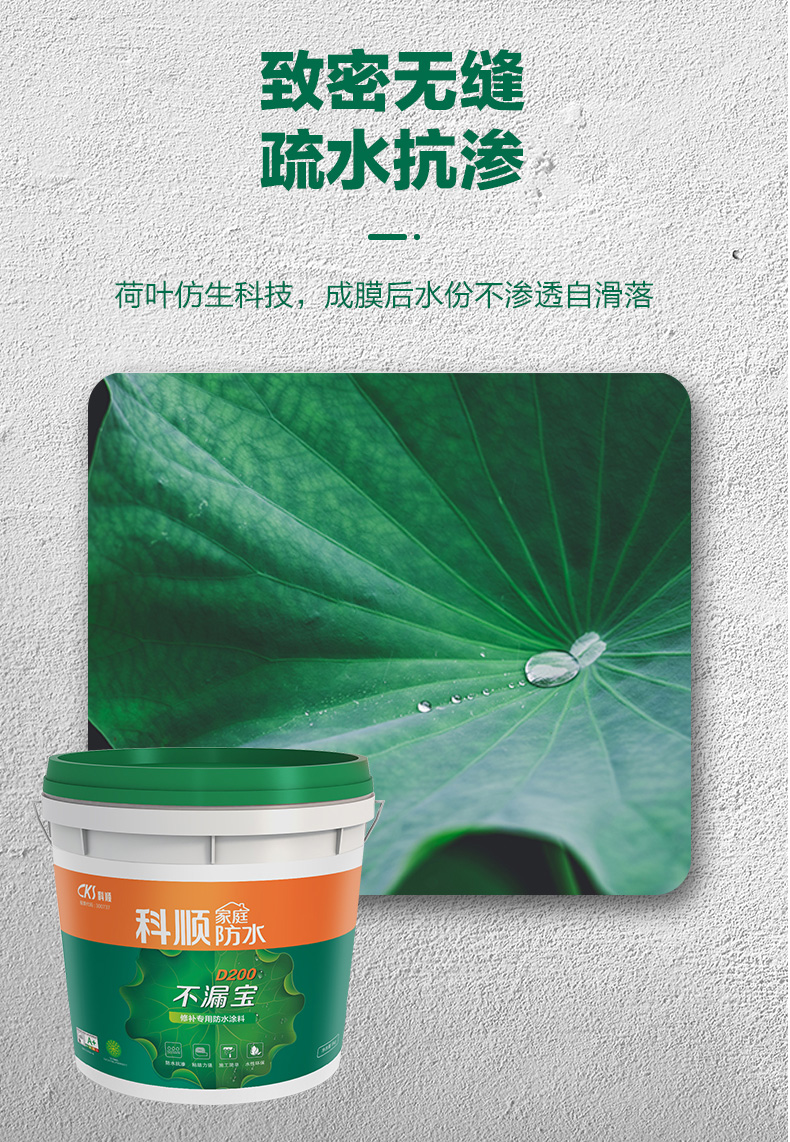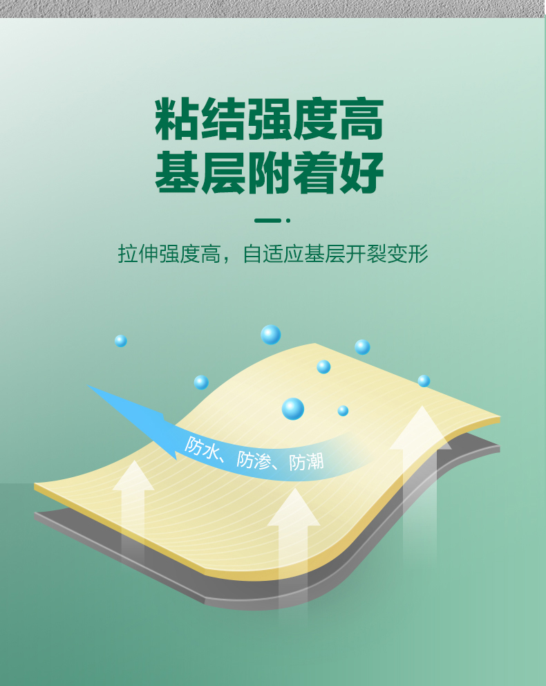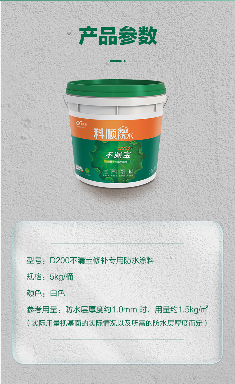 本产品是集堵漏和防水于一体的水性丙烯酸类产品。产品具有粘结力强、拉伸强度高、延伸性能好、适应基层开裂变形能力强等特点。产品适用于混凝土等基材表面的快速修补堵漏。产品以水作为分散介质,是一款水性环保的修补专用防水涂料产品。