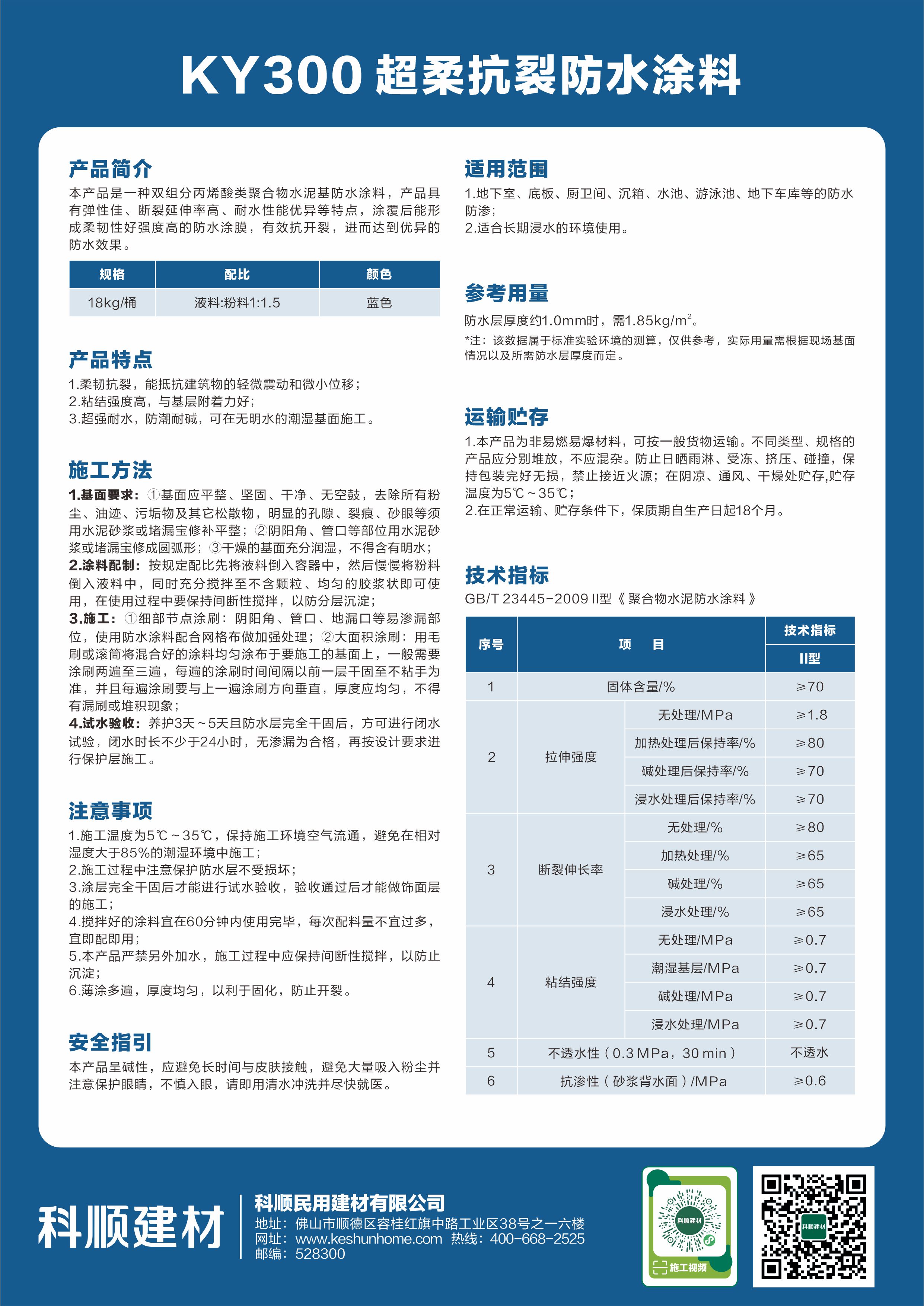 本产品是一种双组分丙烯酸类聚合物水泥基防水涂料,产品具有弹性佳、断裂延伸率高、耐水性能优异等特点,涂覆后能形成柔韧性好强度高的防水涂膜,有效抗开裂,进而达到优异的防水效果。