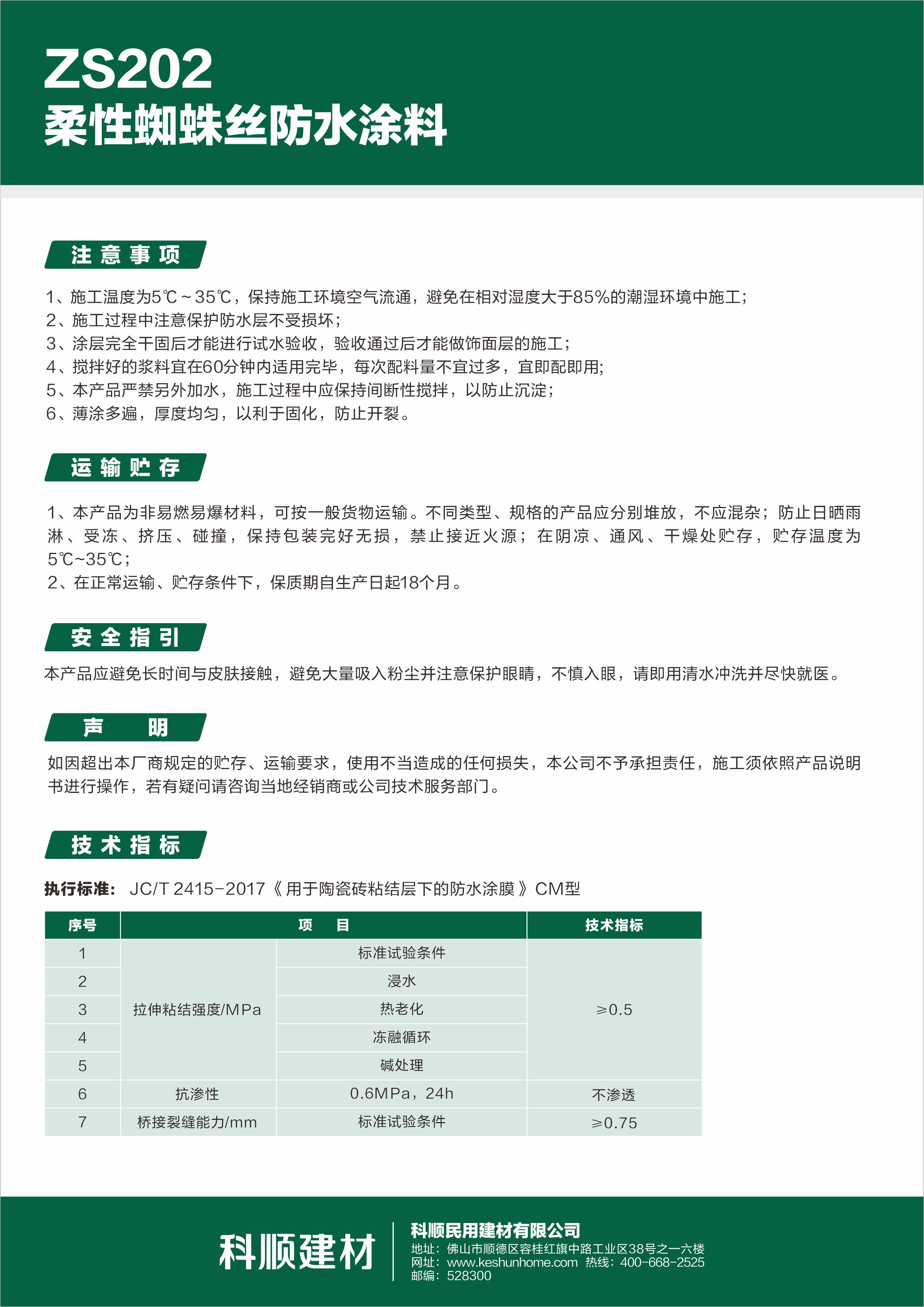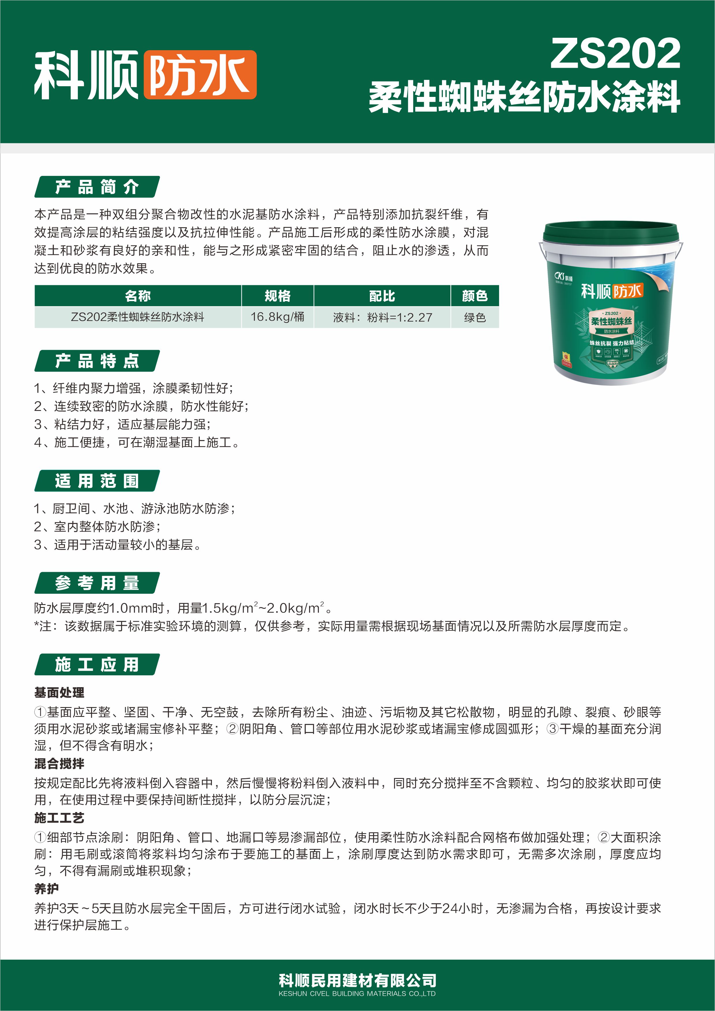 本产品是一种双组分聚合物改性的水泥基防水涂料,产品特别添加抗裂纤维,有效提高涂层的粘结强度以及抗拉伸性能。产品施工后形成的柔性防水涂膜,对混凝土和砂浆有良好的亲和性,能与之形成紧密牢固的结合,阻止水的渗透,从而达到优良的防水效果。