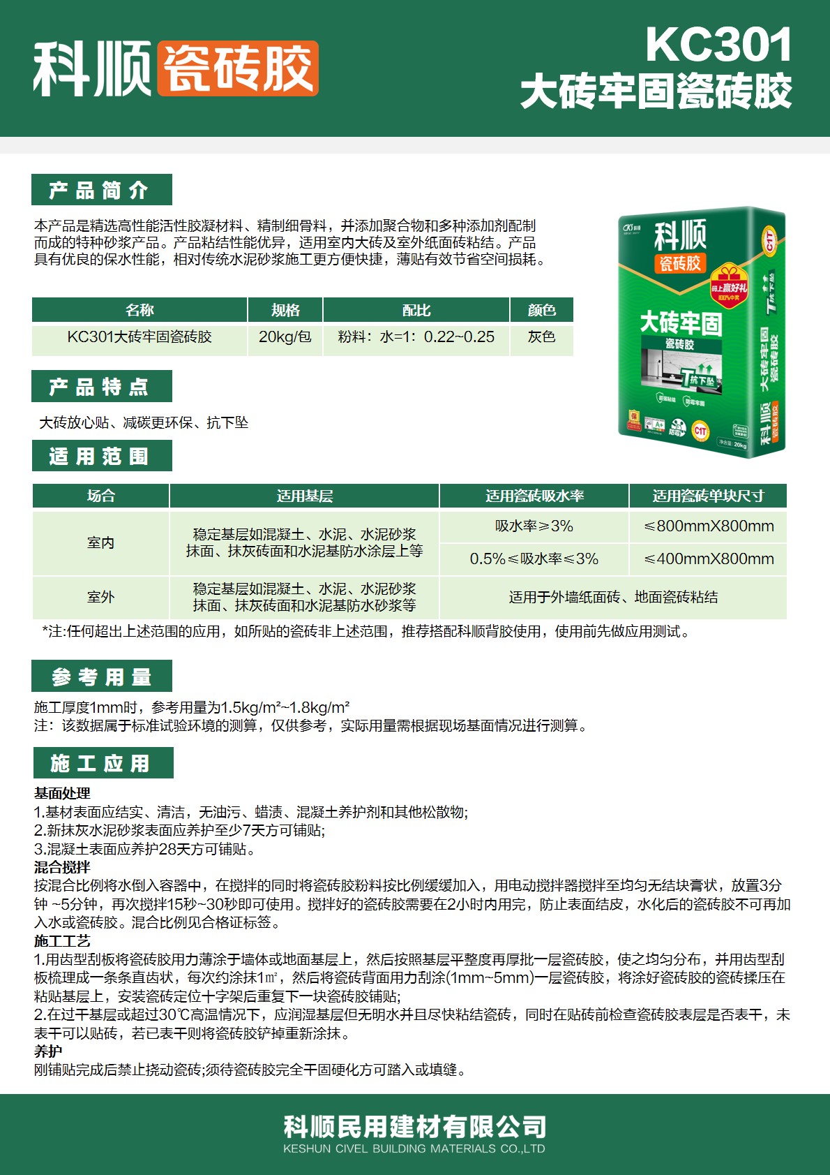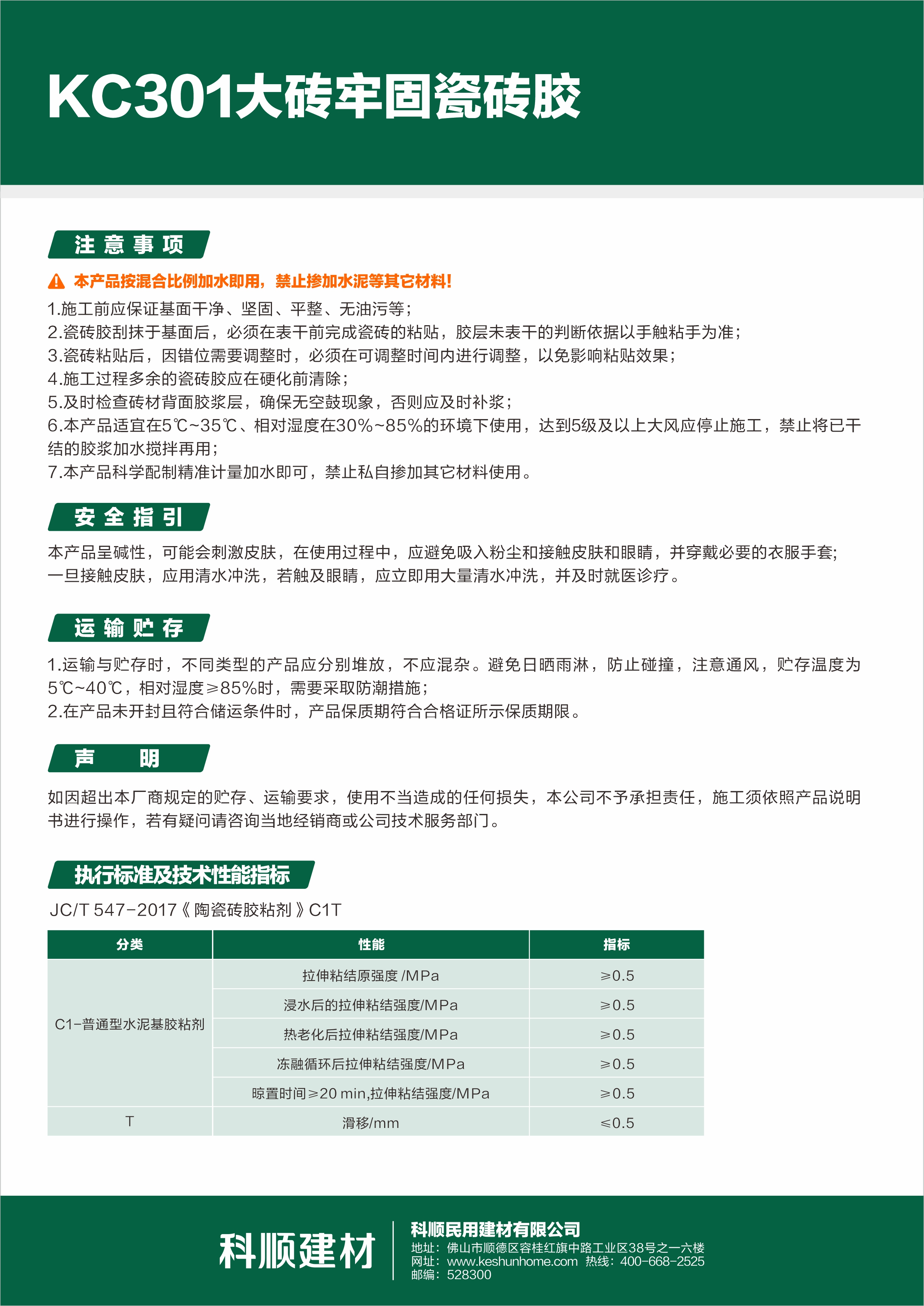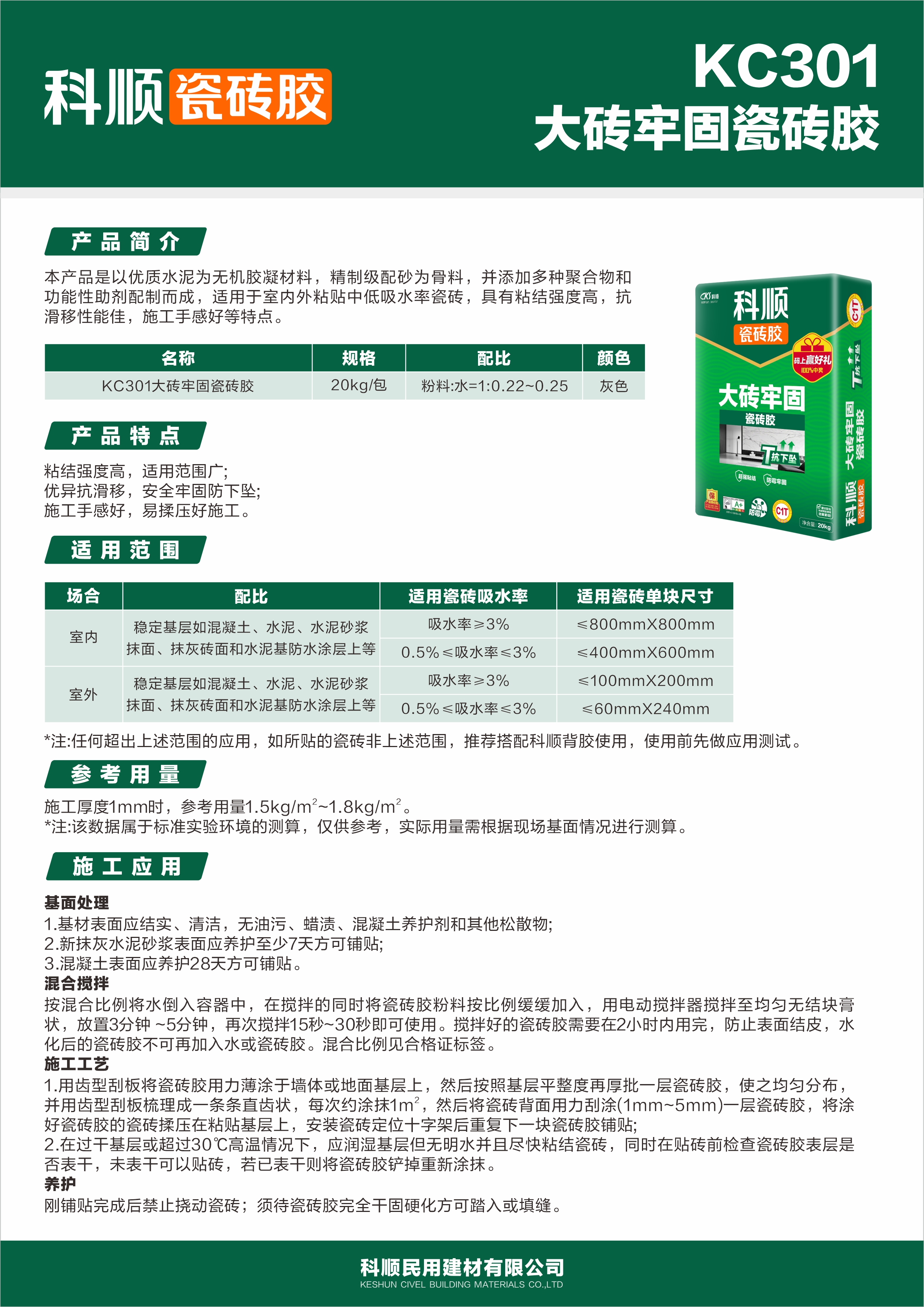 本产品是以优质水泥为无机胶凝材料,精制级配砂为骨料,并添加多种聚合物和功能性助剂配制而成,适用于室内外粘贴中低吸水率瓷砖,具有粘结强度高,抗滑移性能佳,施工手感好等特点。