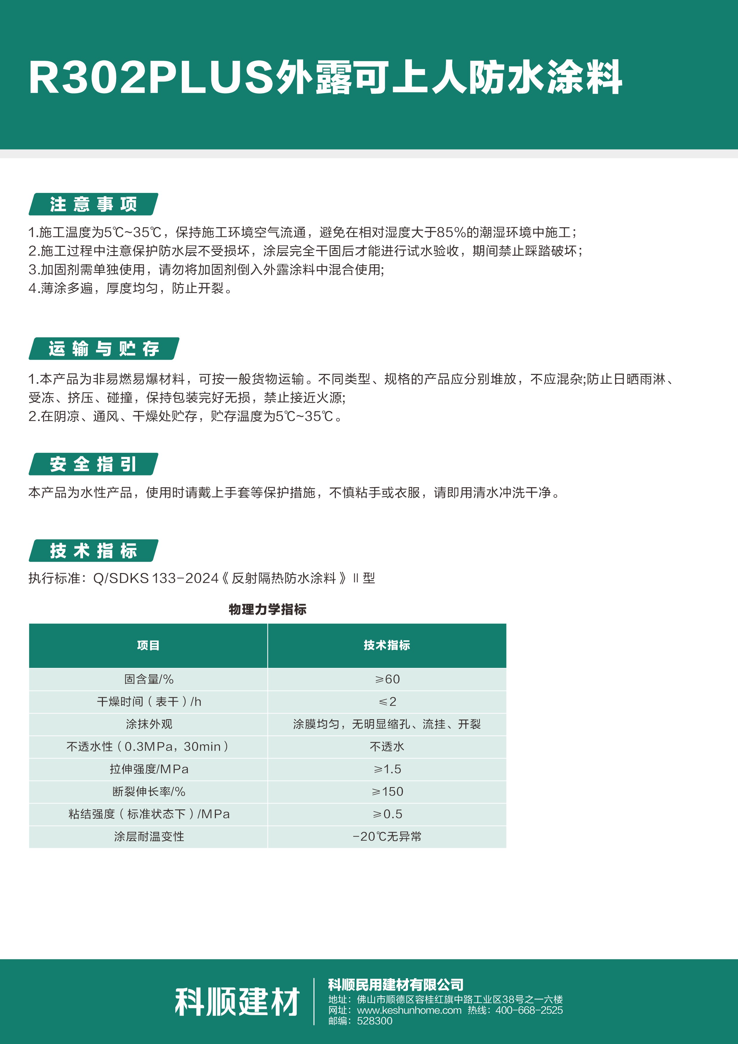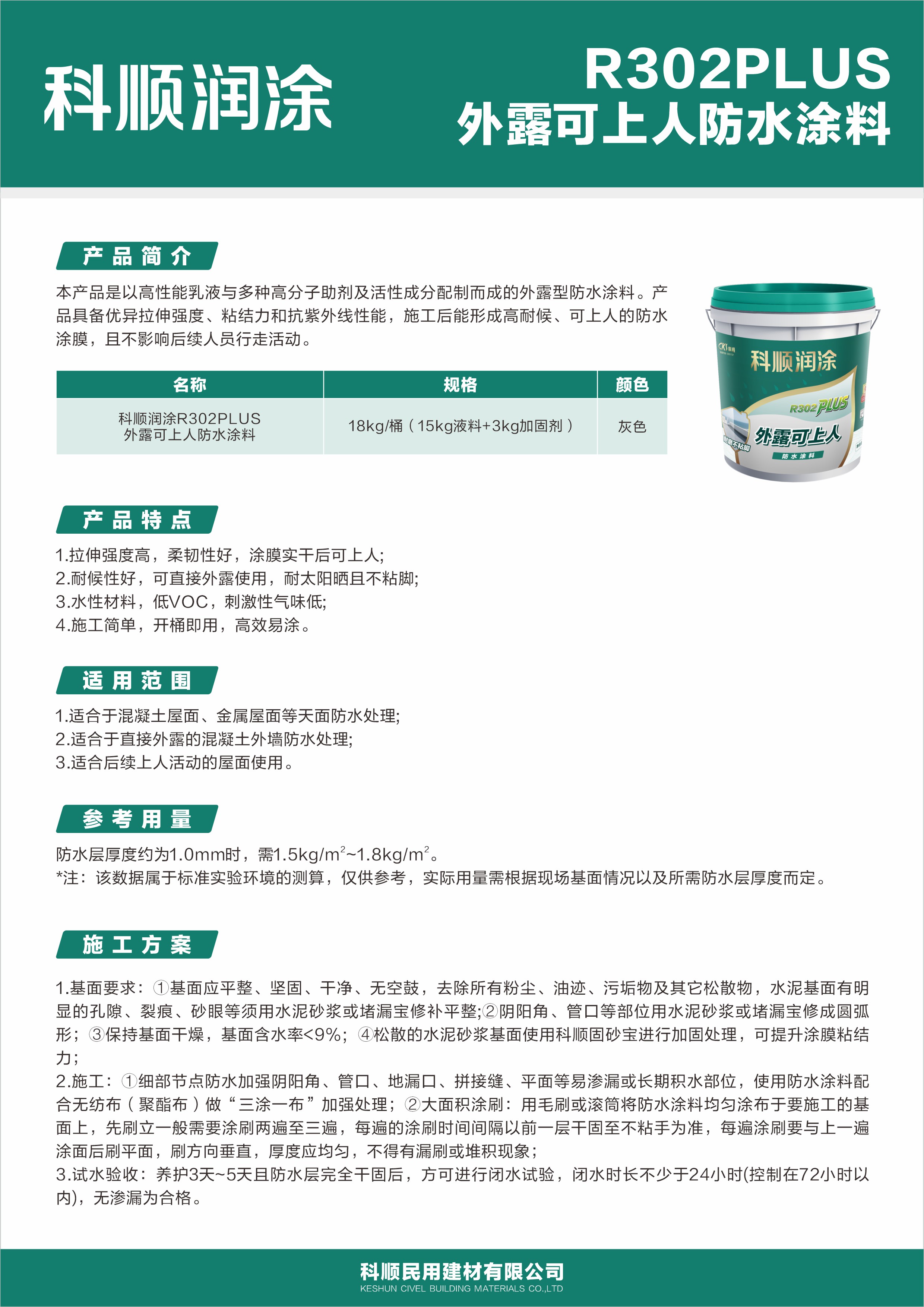 本产品是以高性能乳液与多种高分子助剂及活性成分配制而成的外露型防水涂料。产 品具备优异拉伸强度、粘结力和抗紫外线性能,施工后能形成高耐候、可上人的防水 涂膜,且不影响后续人员行走活动。